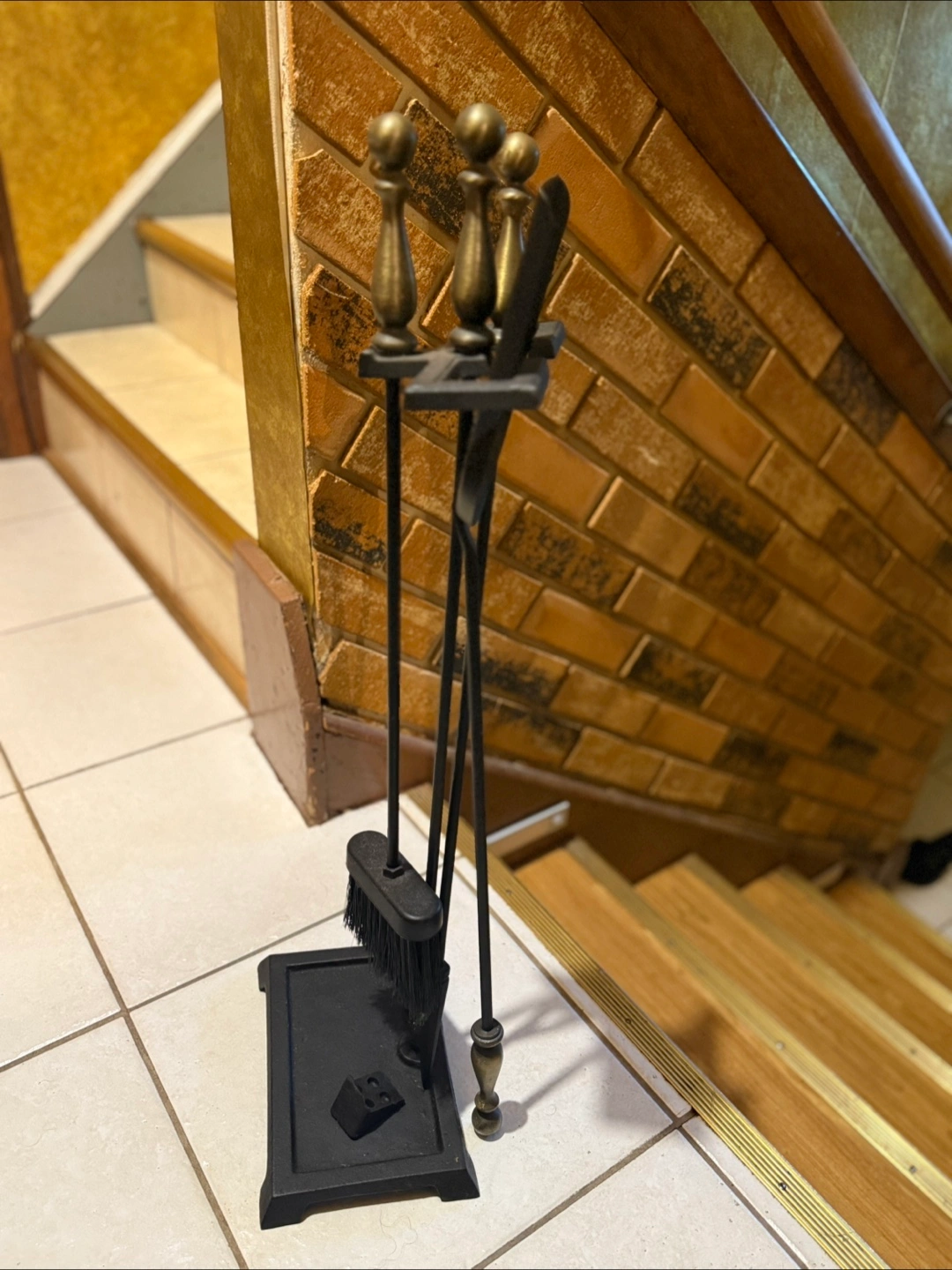 PURCHASED IN THE 1950s & still like new! Selling a fireplace tool set in black metal. It includes the stand, poker, shovel, brush, and tongs. It's in great condition and ready to use by your fireplace! $70 OBO!