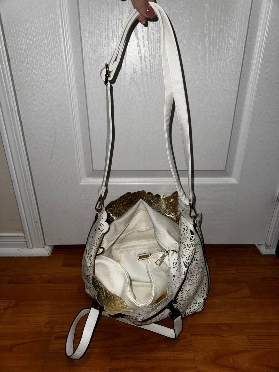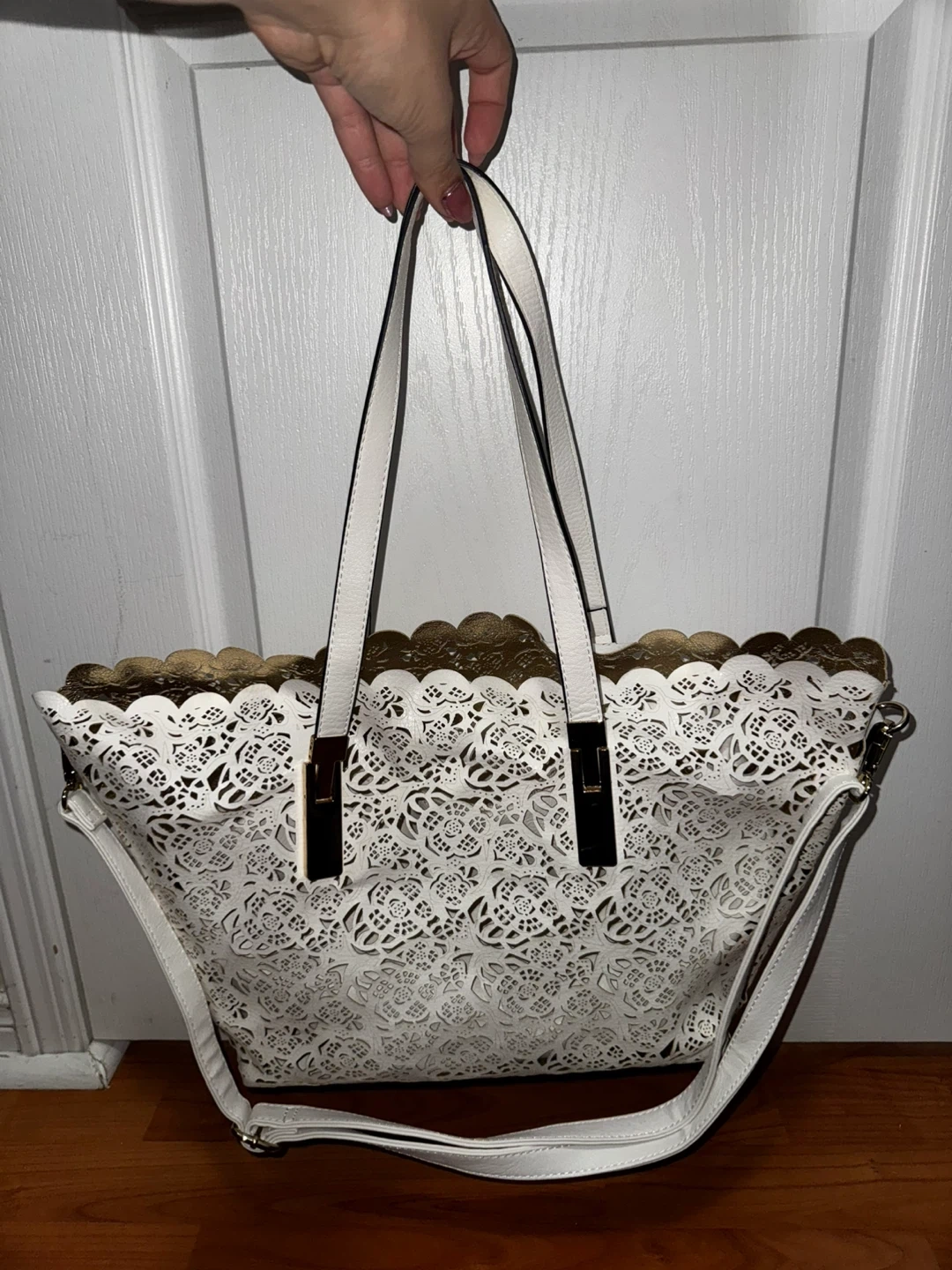 A cute white and gold flower-pattern ALDO tote bag! It's in great condition and perfect for everyday use. The bag features white and gold accents and gold hardware, super cute and functional! Inner white bag insert is removable for a more versatile bag wear. Comes with an additional shoulder strap.