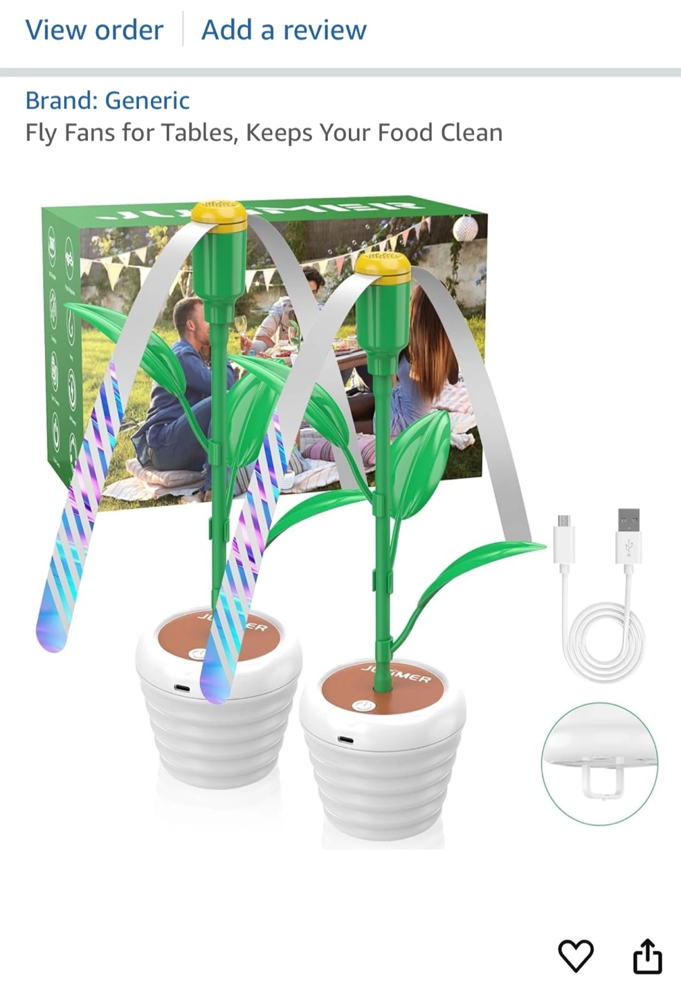 Keep your food clean with these fly fans for tables! They are in a cute flower pot design and come with a USB charger cable