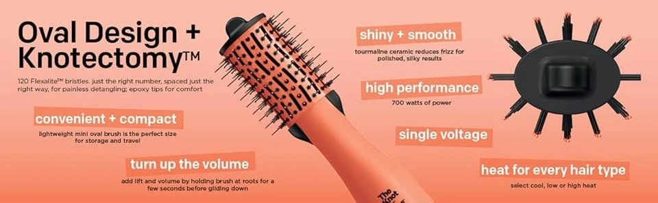 Our Light weight (0.5 lb) oval brush is powered with 700 watts. Style, dry, detangle, de-frizz, volumize—this one-of-a-kind hair styling tool in a travel-friendly compact design does it all. It helps add lift and volume by holding brush at roots for a few seconds before gliding down your hair. Convenient and compact all-in-one solution at-home and on-the-go. Provides salon performance and helps refresh your hair between shampoos