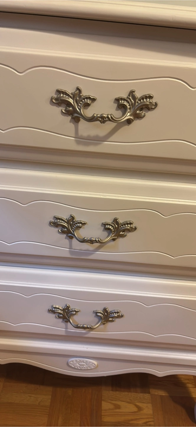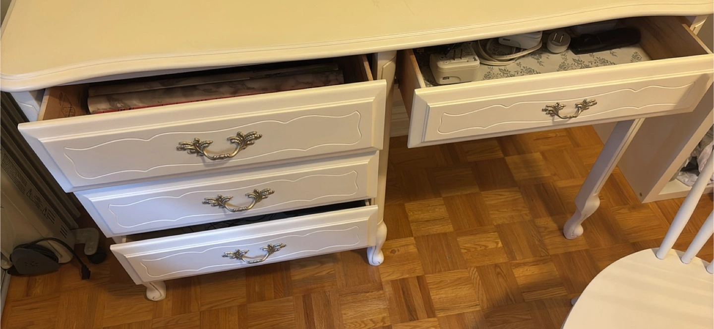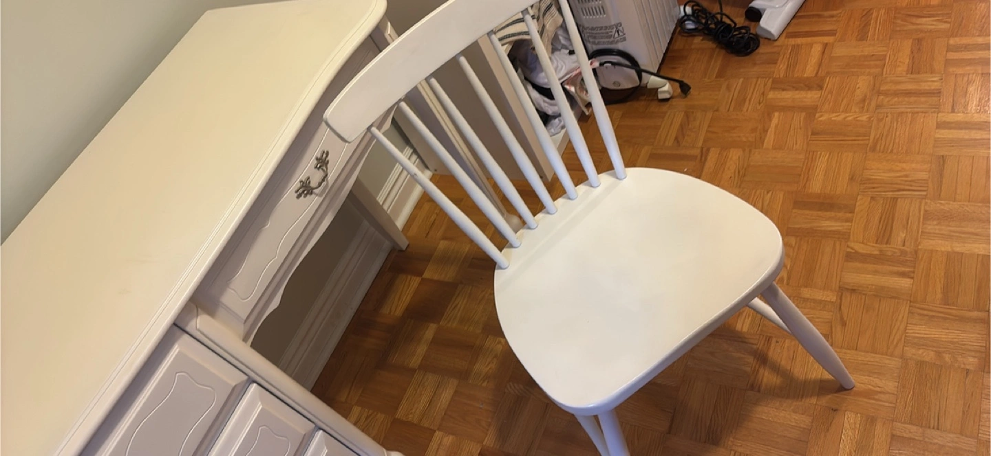 Selling a charming vintage vanity desk with a matching chair. It's perfect for adding a touch of elegance to any room. The set is in good condition and ready for a new home. The vanity features lovely drawer pulls and a classic design. The chair complements the desk beautifully, making it a complete set for your space