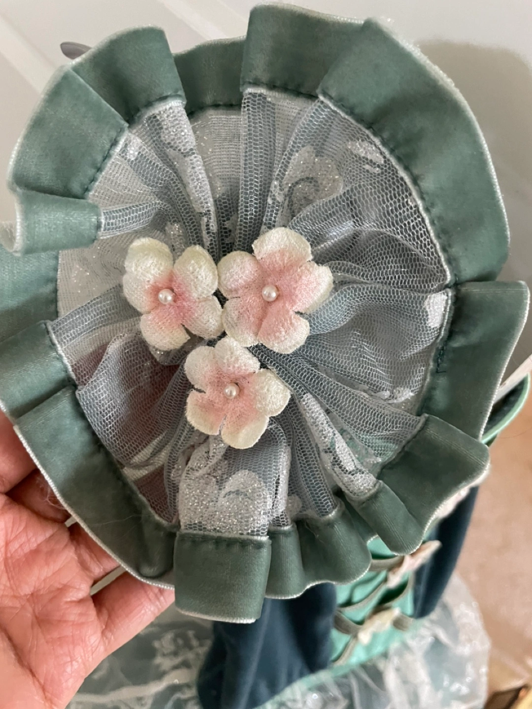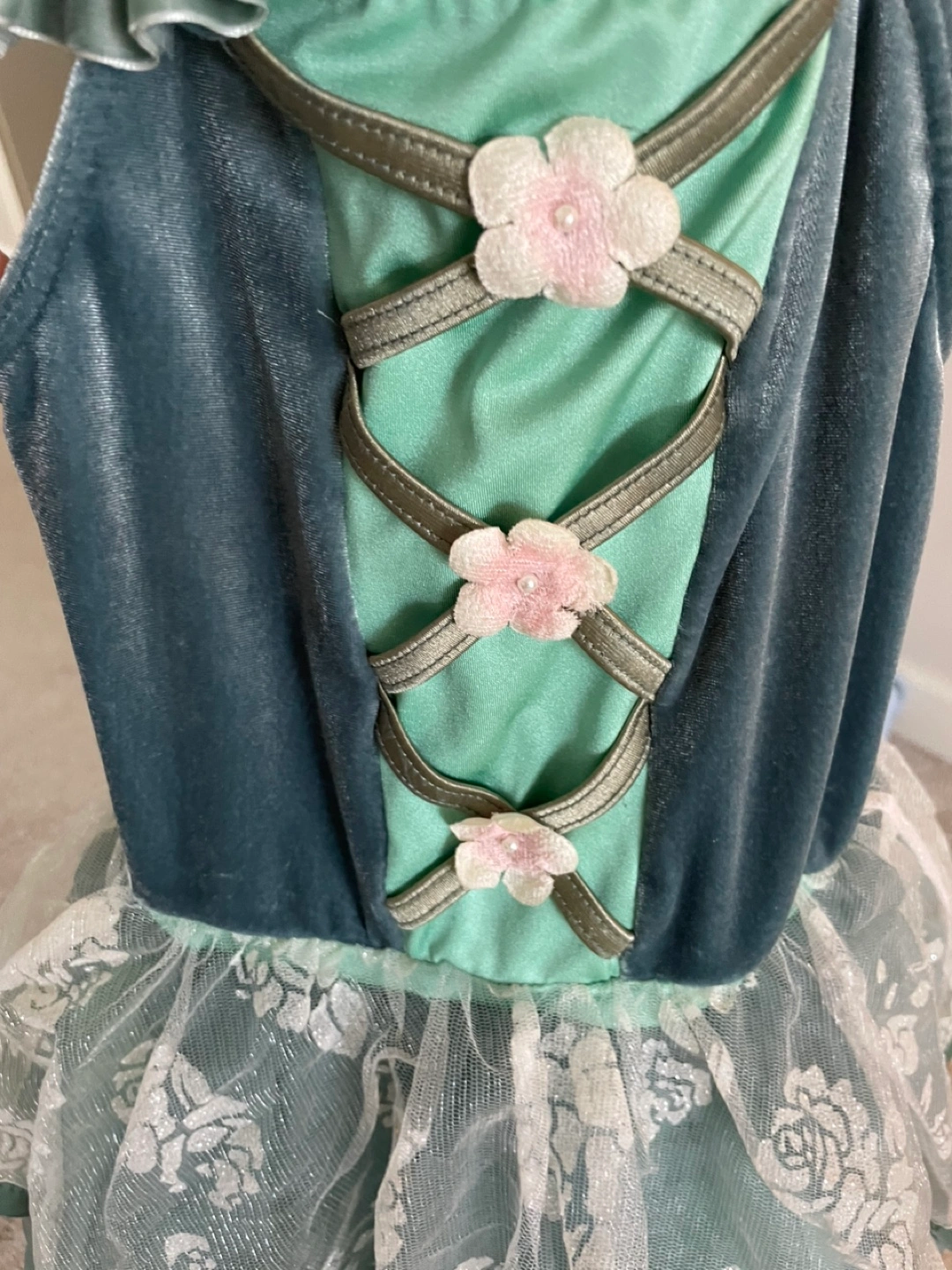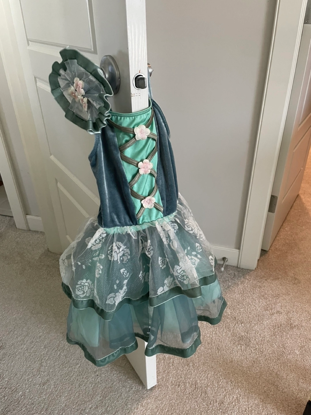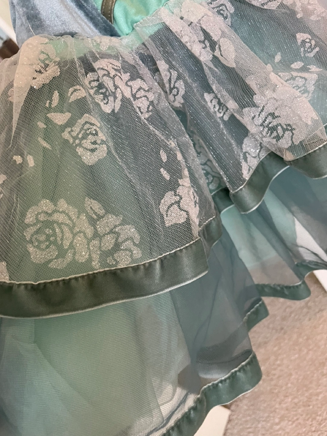A beautiful girl's dress in shades of green and blue. It features a velvet bodice with floral accents and a layered tulle skirt with lace detailing. Perfect for a special occasion or dress-up! Paid $65 for this!
