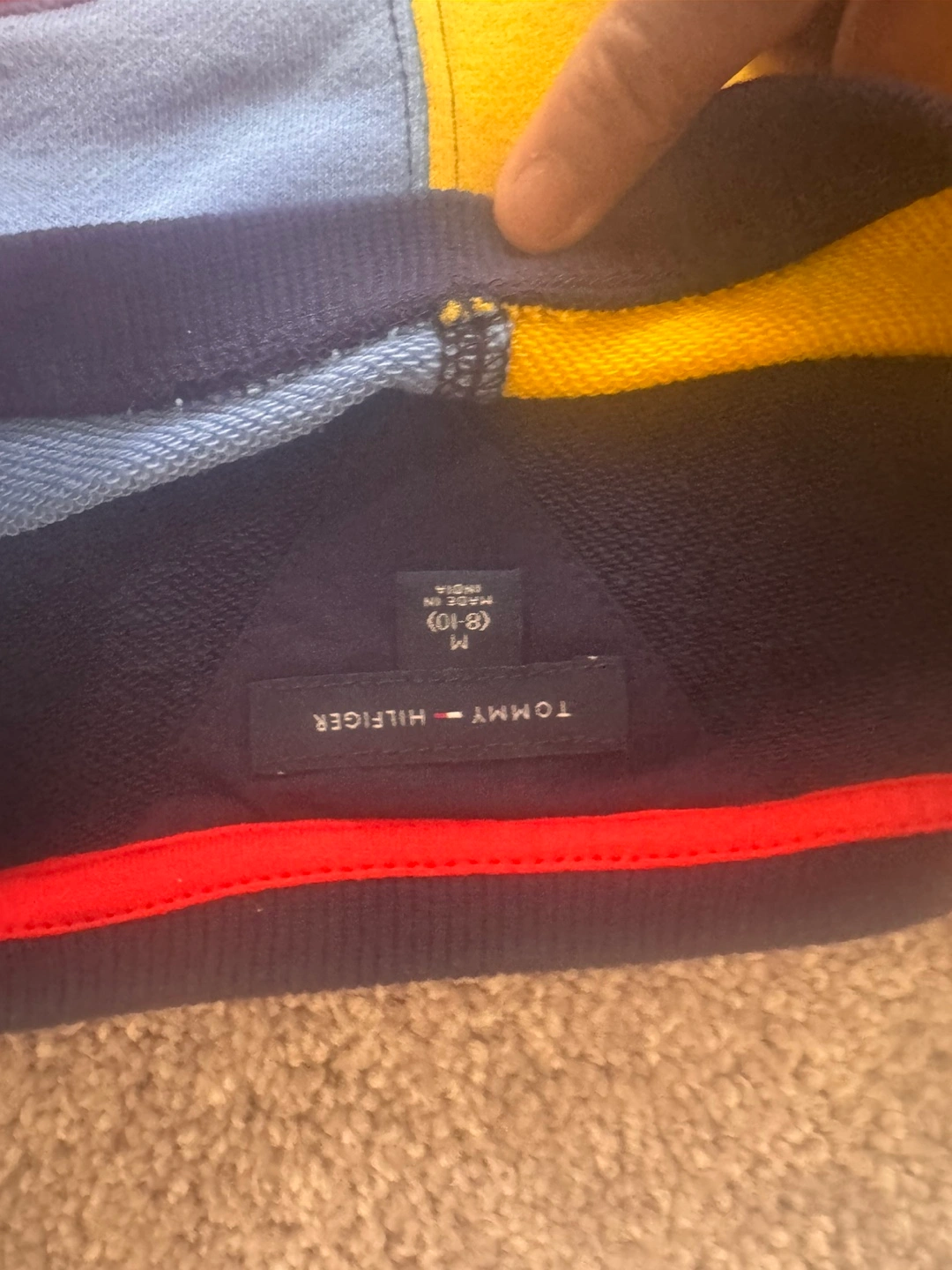 Selling a Tommy Hilfiger colour block sweatshirt in size M. (8-10) It features a unique patchwork design with various colours. Great for adding a pop of colour to your wardrobe!