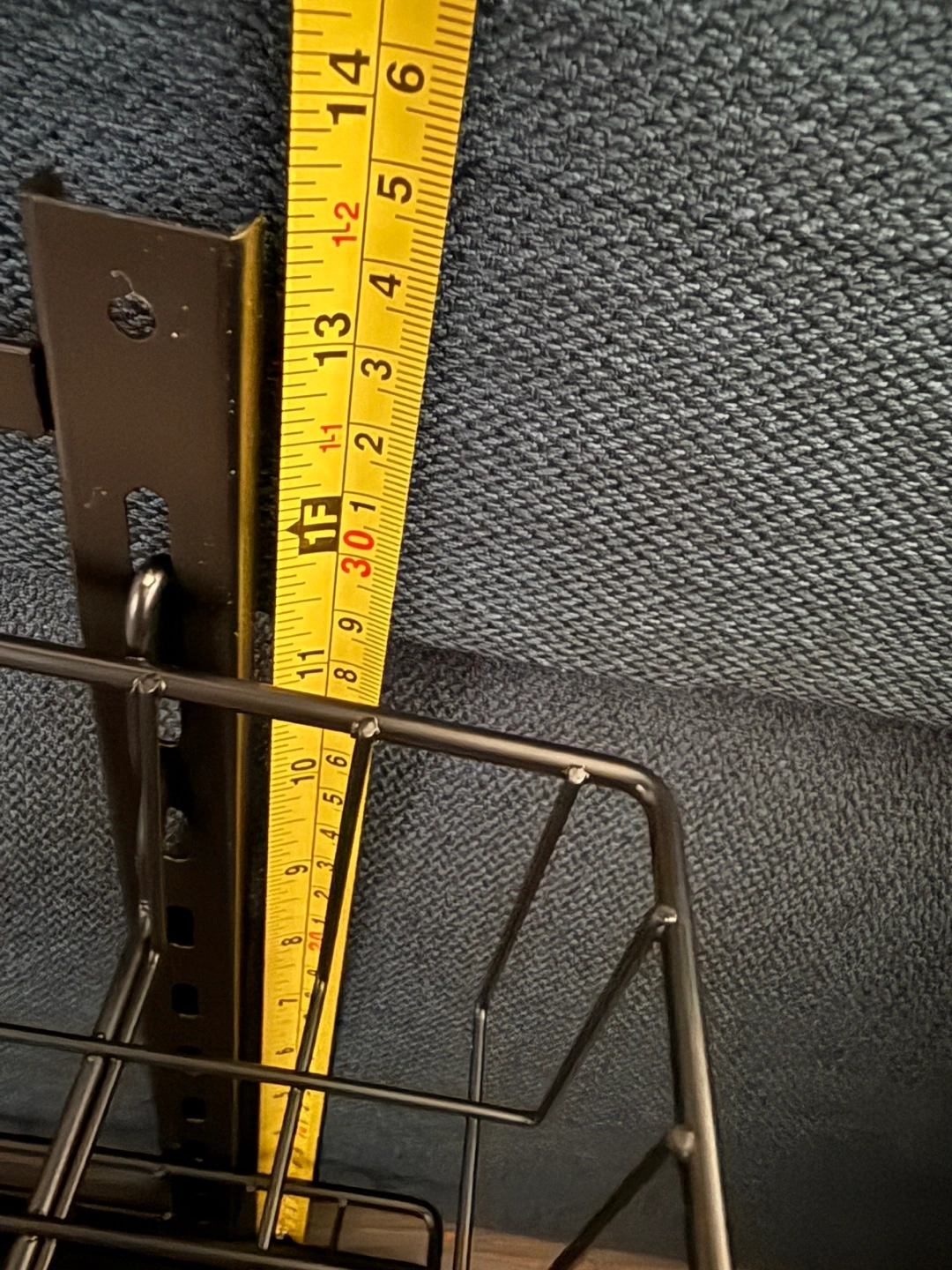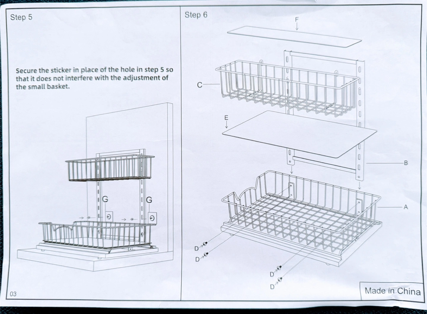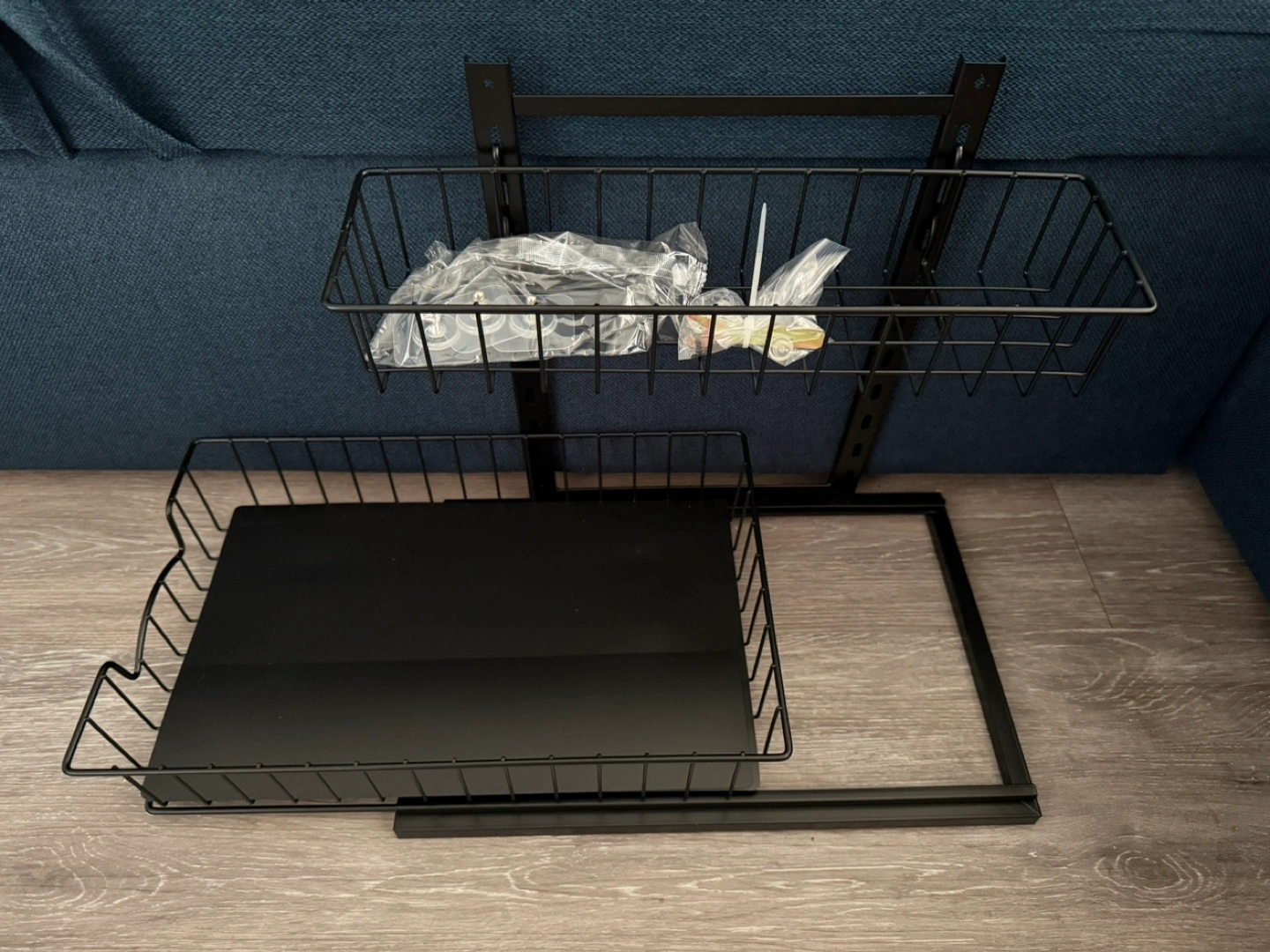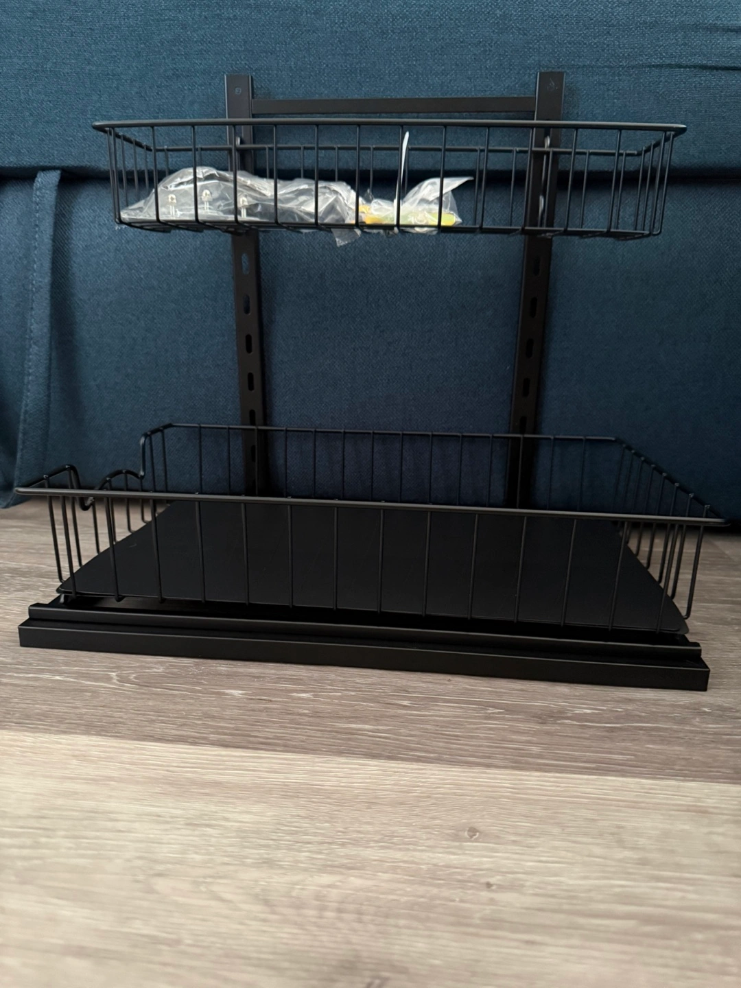 I'm selling a brand new, black metal two-tier sliding organizer. It's still in its original packaging with all the components. The unit is approximately 37 cm wide, 24 cm deep and 34 cm tall, perfect for saving space in your kitchen or storage cabinet.