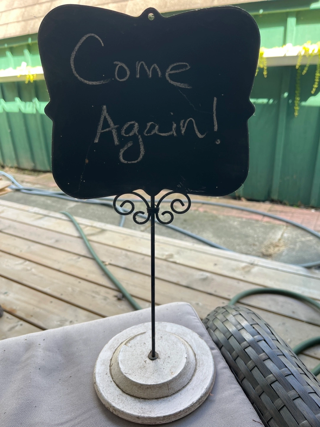 A cute chalkboard sign. Perfect for adding a touch of charm to your store or garden. I used it on my back porch to write fun messages. It’s a little worn from the weather, use it as is or add a touch of paint to the base for a fresh start! Free!