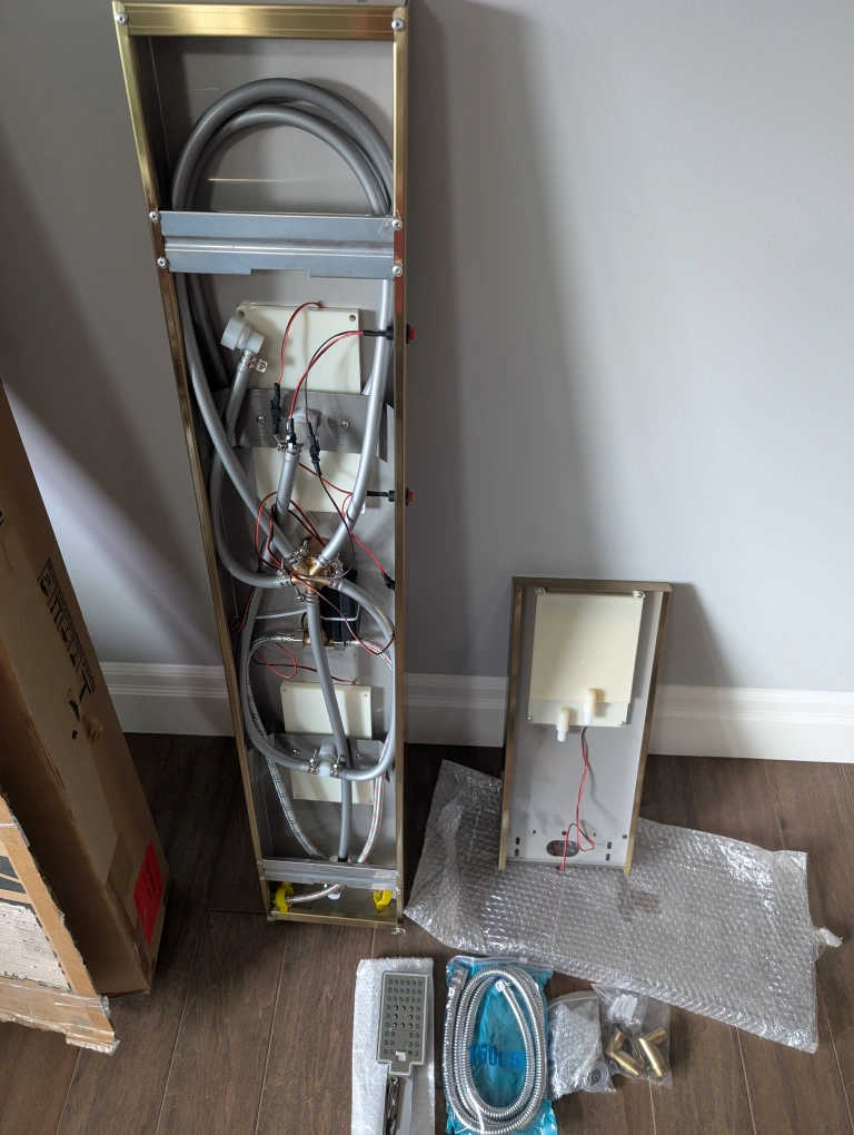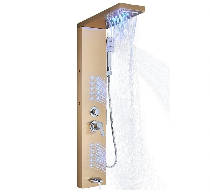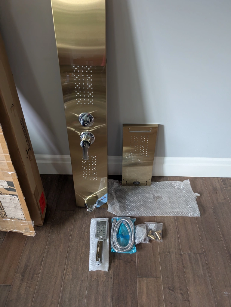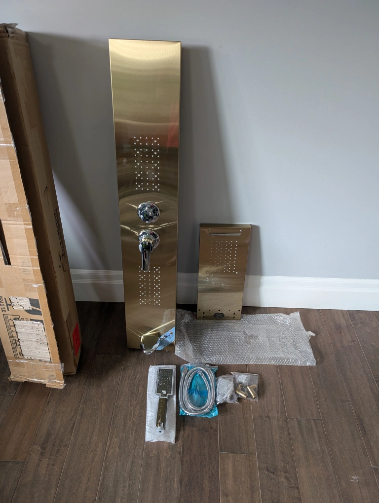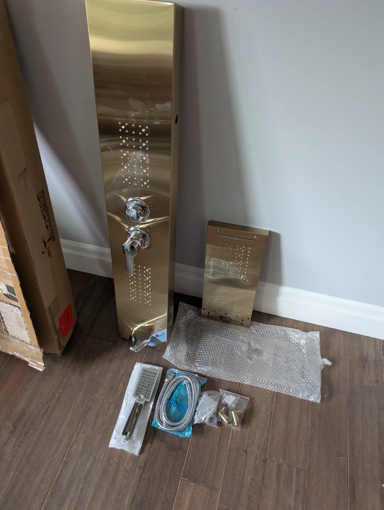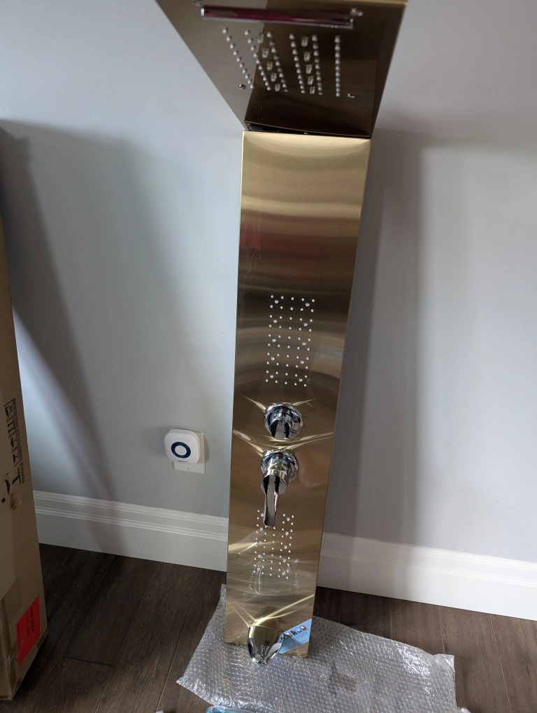 231Brand new brushed gold shower panel tower for sale. LED rainfall, waterfall, tub spout, massage jets shower column, wand, column with mixer valve, $125 FIRM. faucet, water, reno, vanity, counter, water, bathroom, sink, renovation, hose, plumbing, kitchen, drain, shower, tub, bath, bathtub, swivel, pull down, pull out, spray, nozzle, handle, Moen, Delta, dishes, column, tower, massage, jets, LED, temperature, valve, rainfall, waterfall, wand, spout