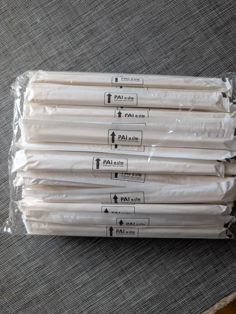 Here's a bundle of chopsticks from PAI Northern Thai Kitchen, all neatly packaged and ready for your next meal! Perfect for enjoying takeout or adding a touch of authenticity to your home-cooked dishes