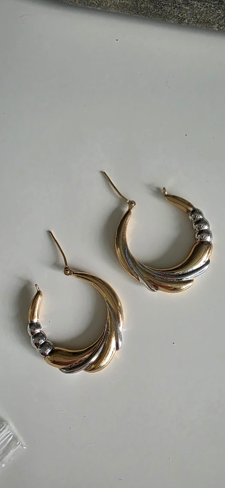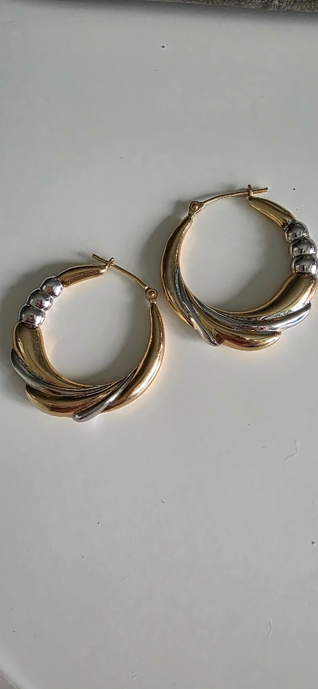 Selling a pair of hoop earrings with a yellow and white gold design. They're in great shape and ready to add a touch of elegance to your look. worn only once. Bought at Winners a few years back.
