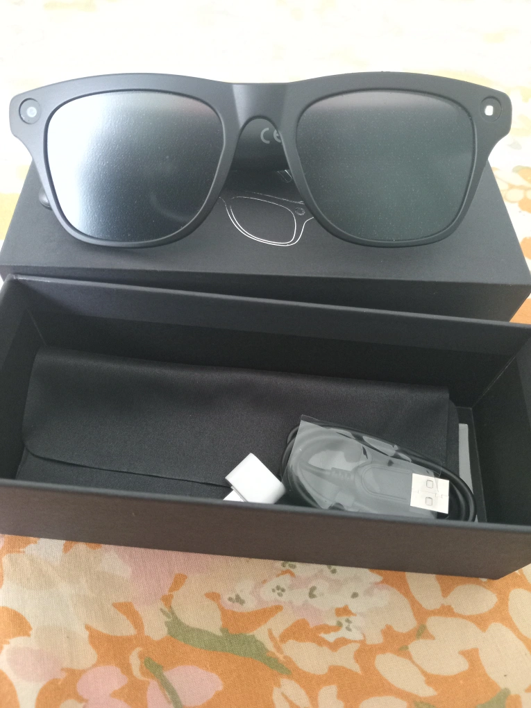 Selling a pair of smart Glasses in black. They're in new and come with the original box and included components like the charger. These glasses feature a camera, flashlight, touch button, speaker, charging port, and physical buttons. Great for listening to music or taking calls on the go!
