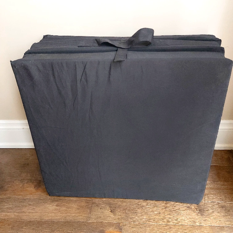 Selling a tri-fold foam mattress in black. It's in great shape and perfect for guests or small spaces. This mattress folds up for easy storage, making it super convenient. It's a simple and practical solution for extra sleeping space!