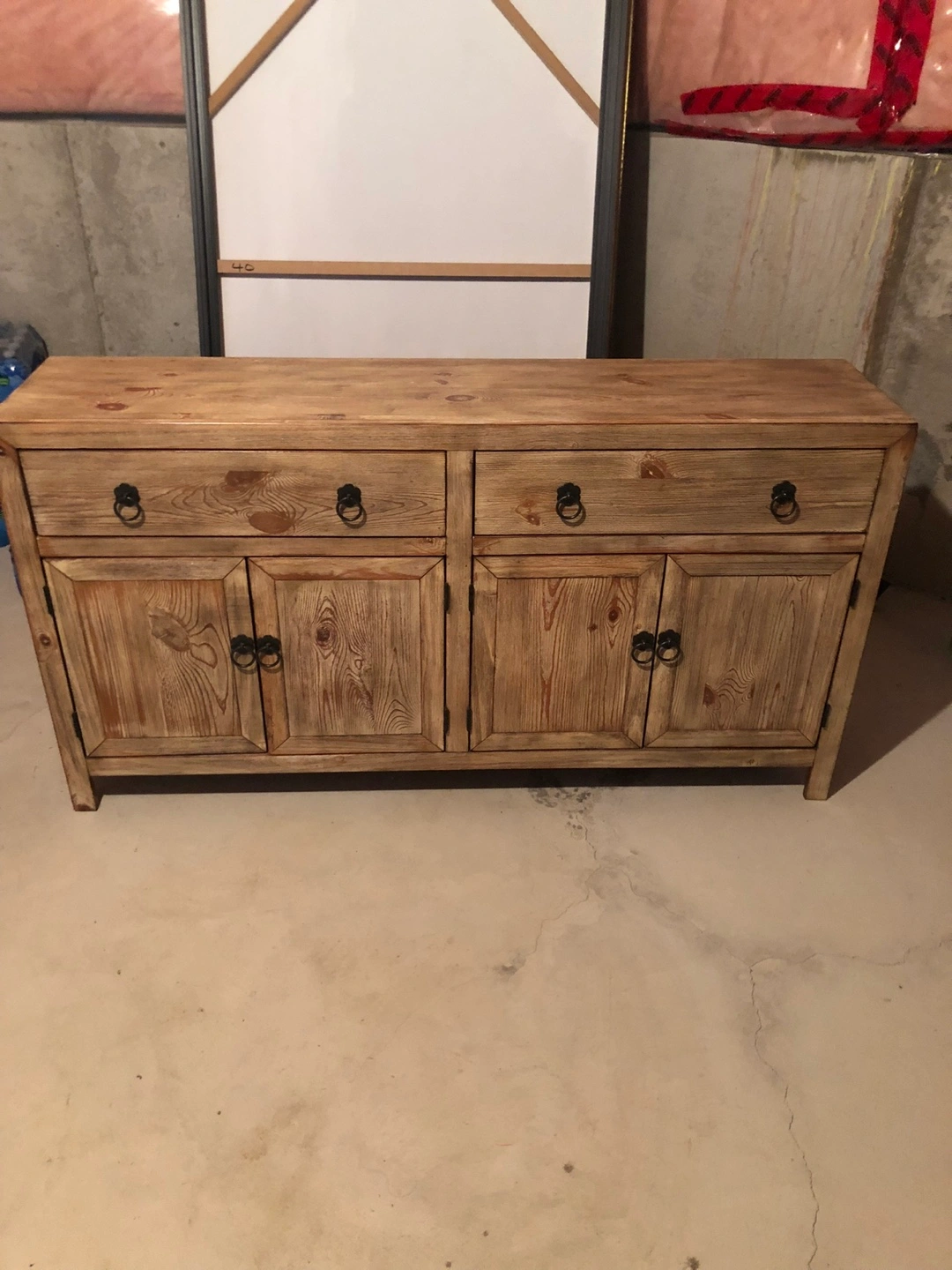 Selling a wooden cabinet or sideboard. It has a natural wood finish and features drawers and cabinet doors. Perfect for adding storage and style to your home!