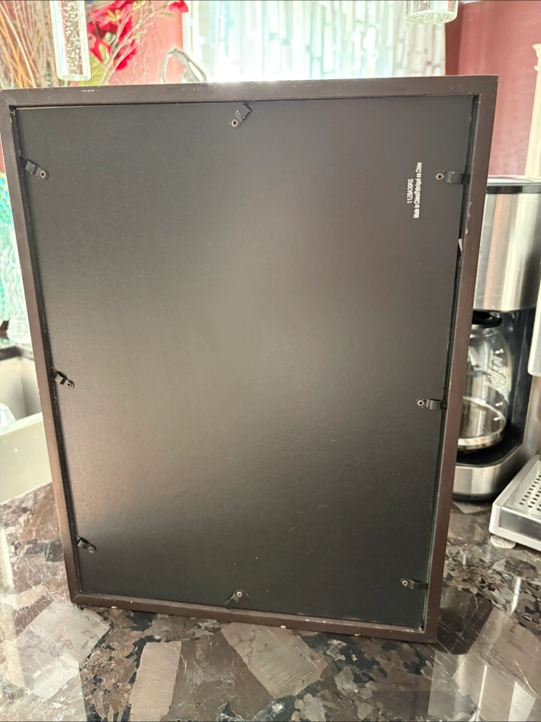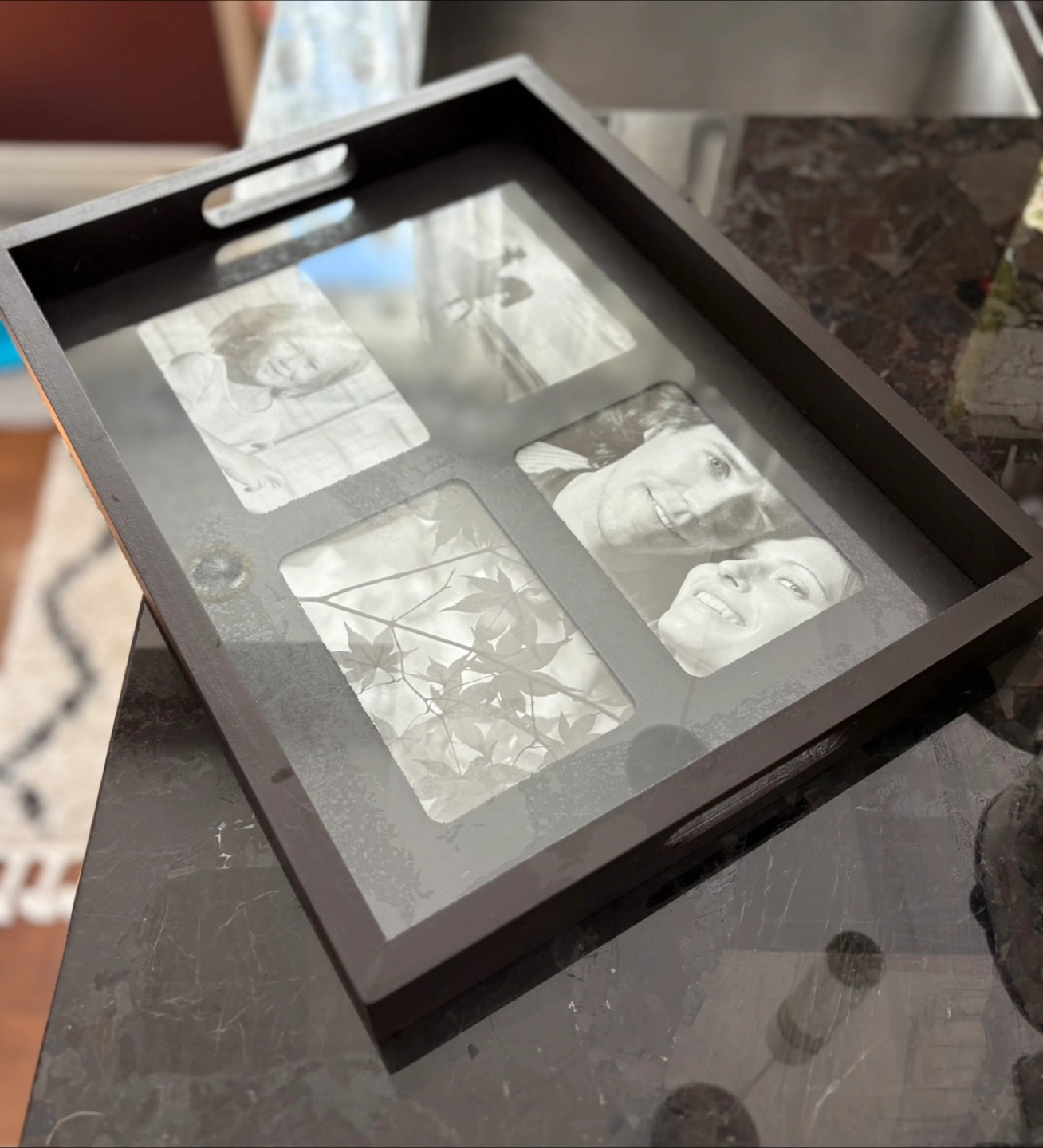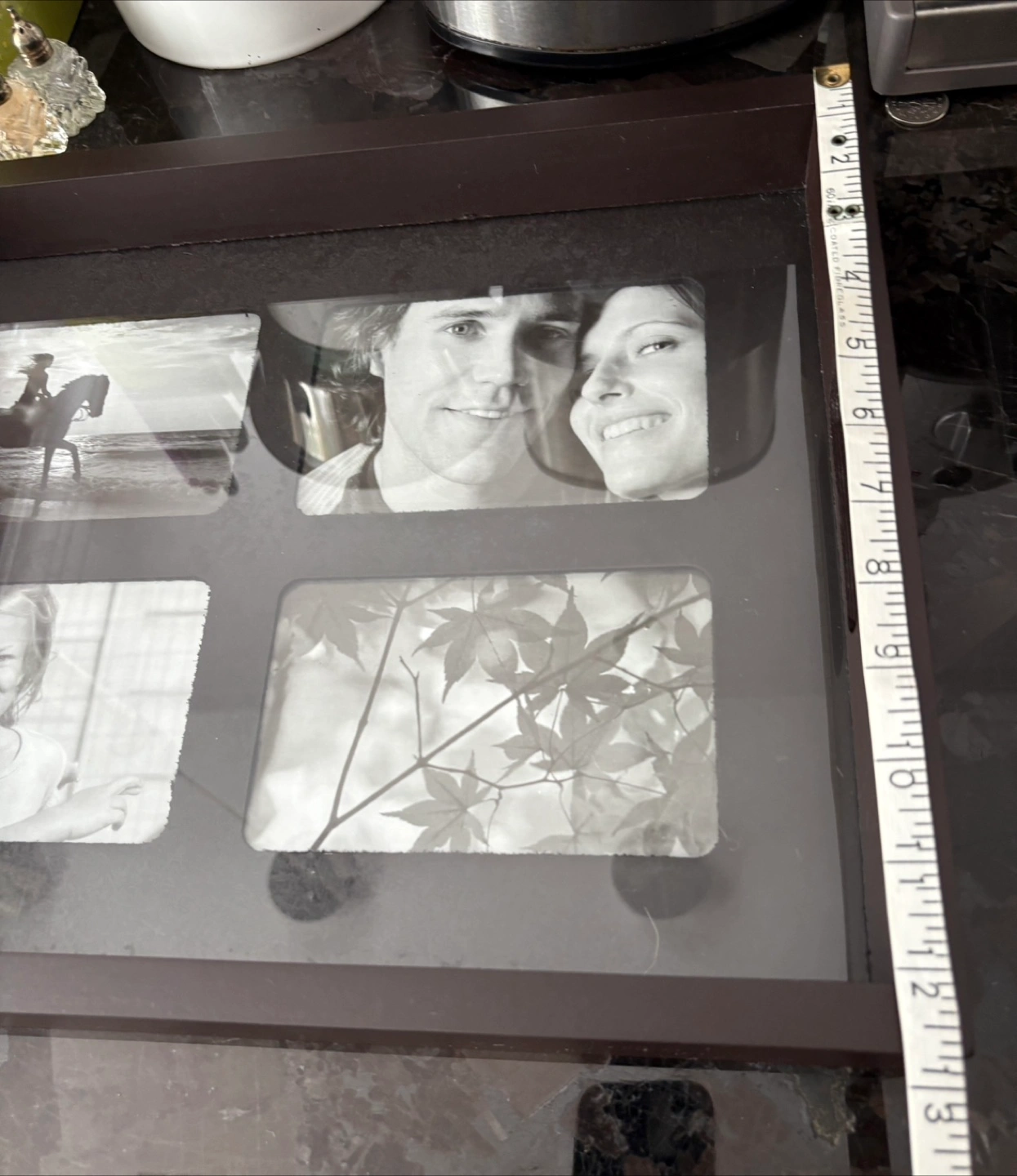 I'm selling a brown wooden photo collage tray. It features four photo slots and handles on either side. It measures approximately 16 inches by 12 inches. Perfect for displaying your favourite memories!