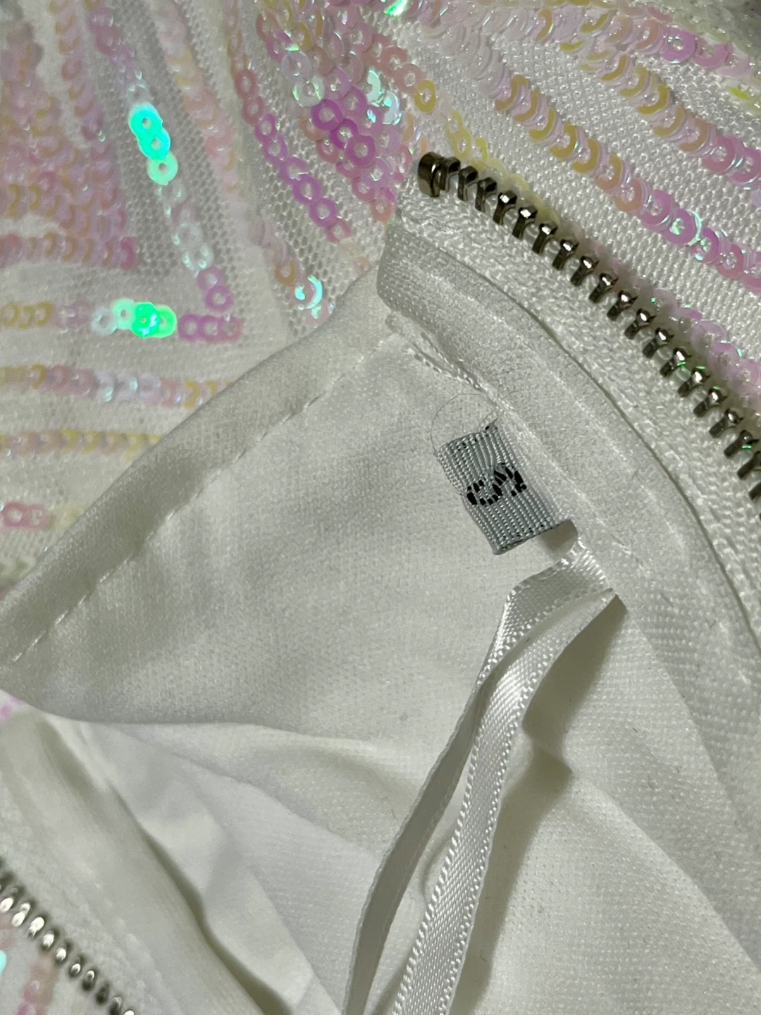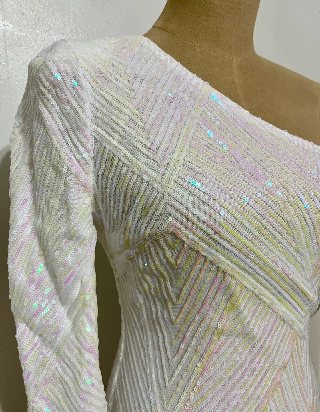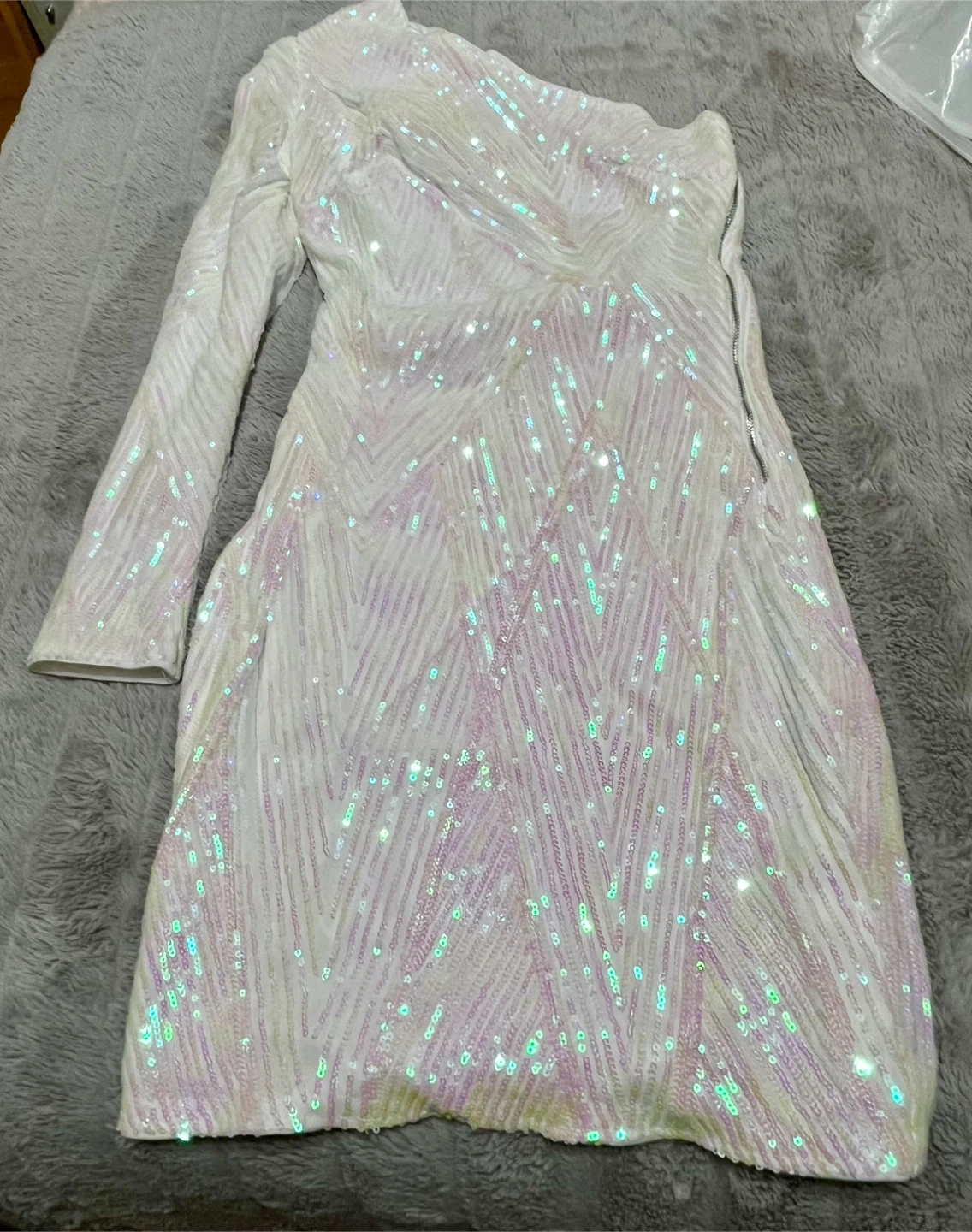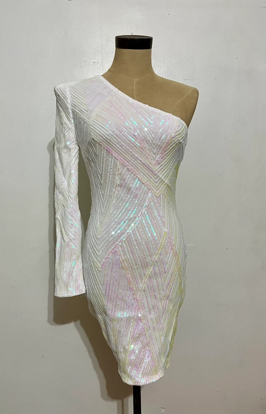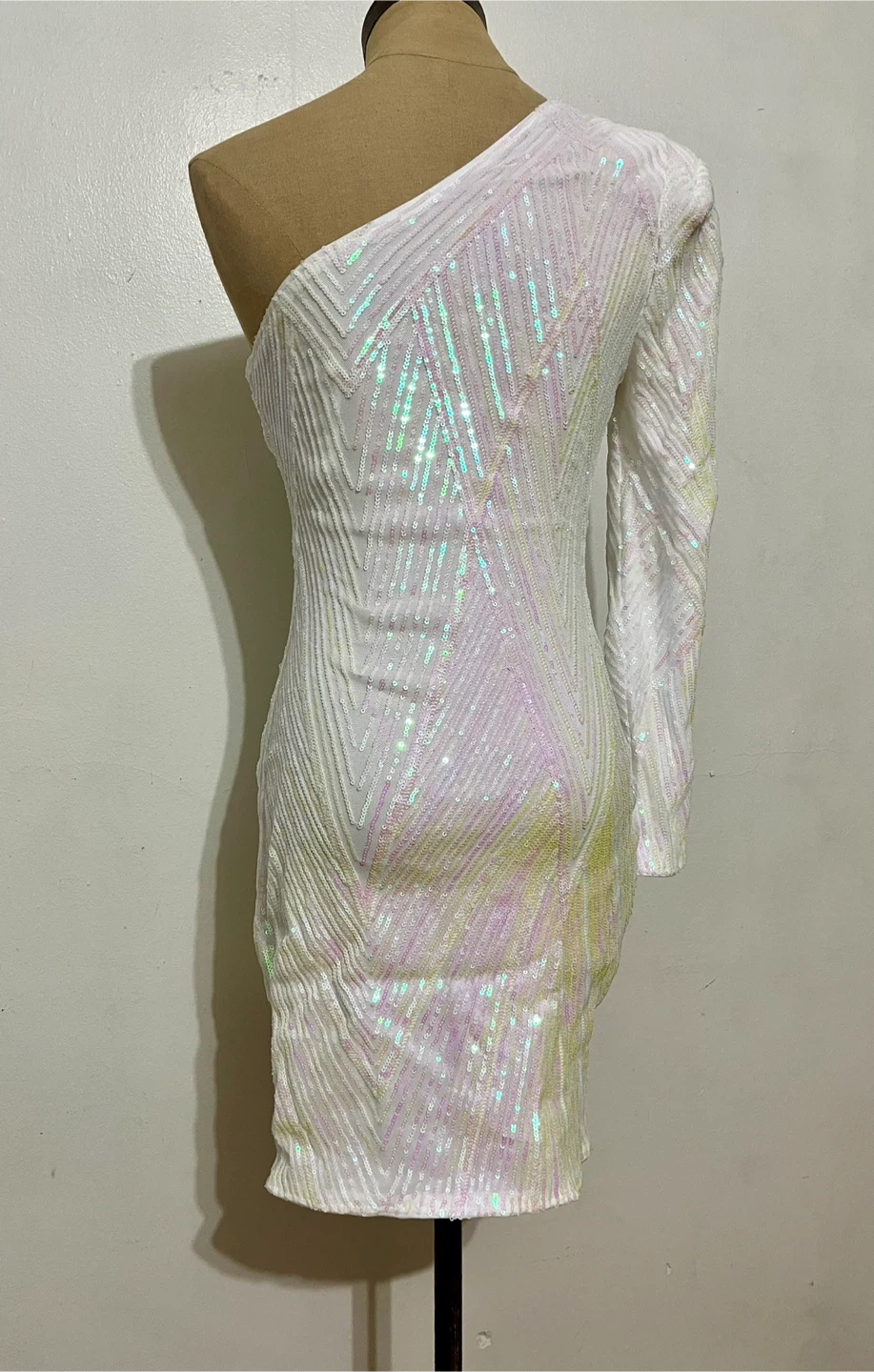 This cute white one-shoulder mini dress is covered in iridescent sequins. It features a full-length sleeve with shoulder pad on one side and a geometric sequin pattern. The sequins are a mix of yellow and pink with hints of white. Very form fitting, no stretch.