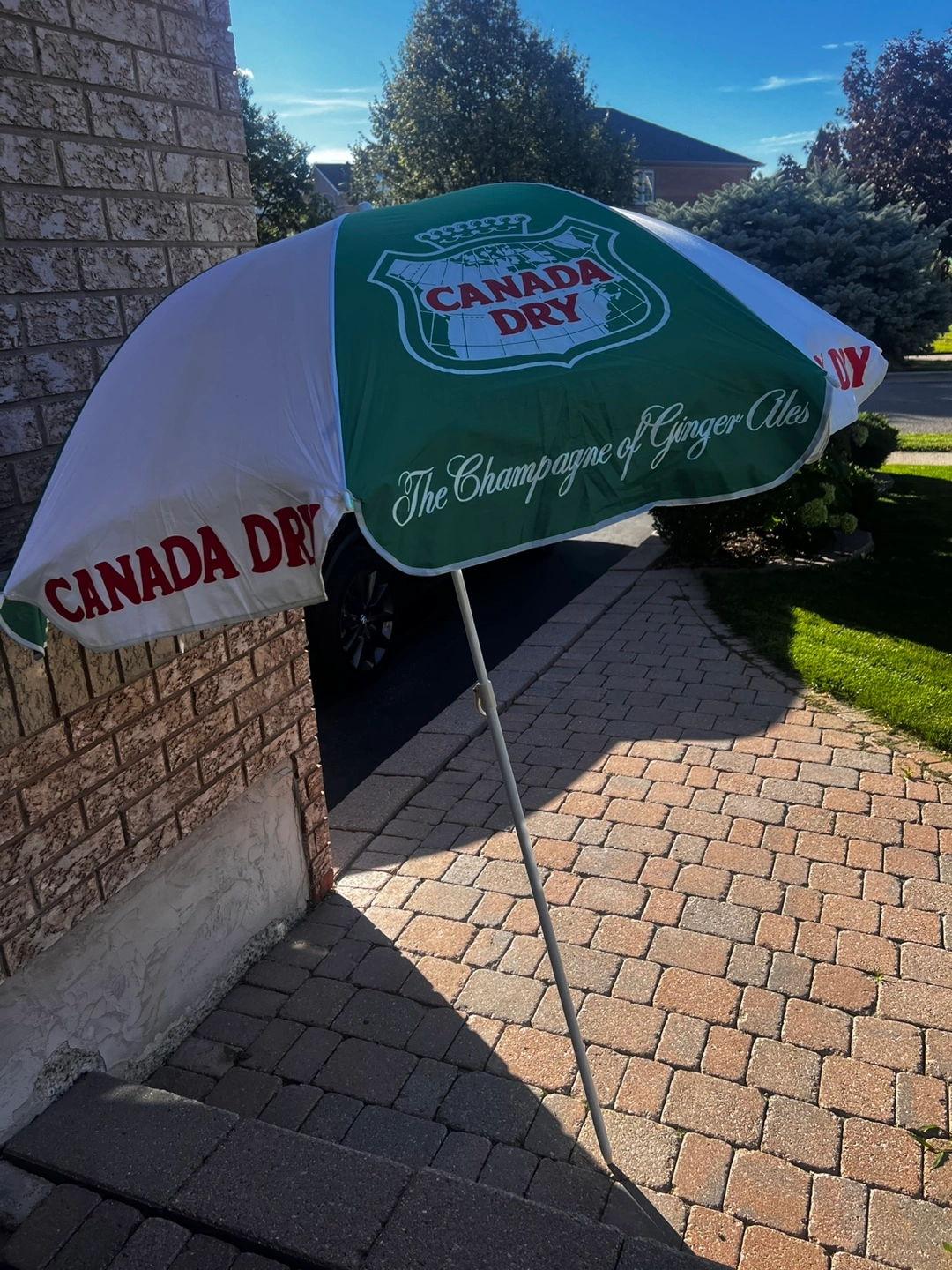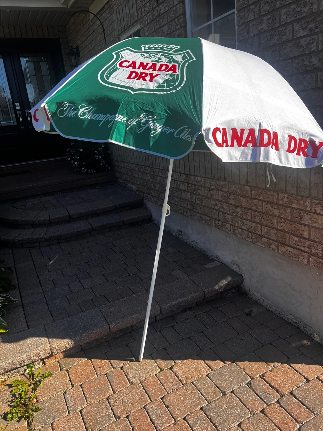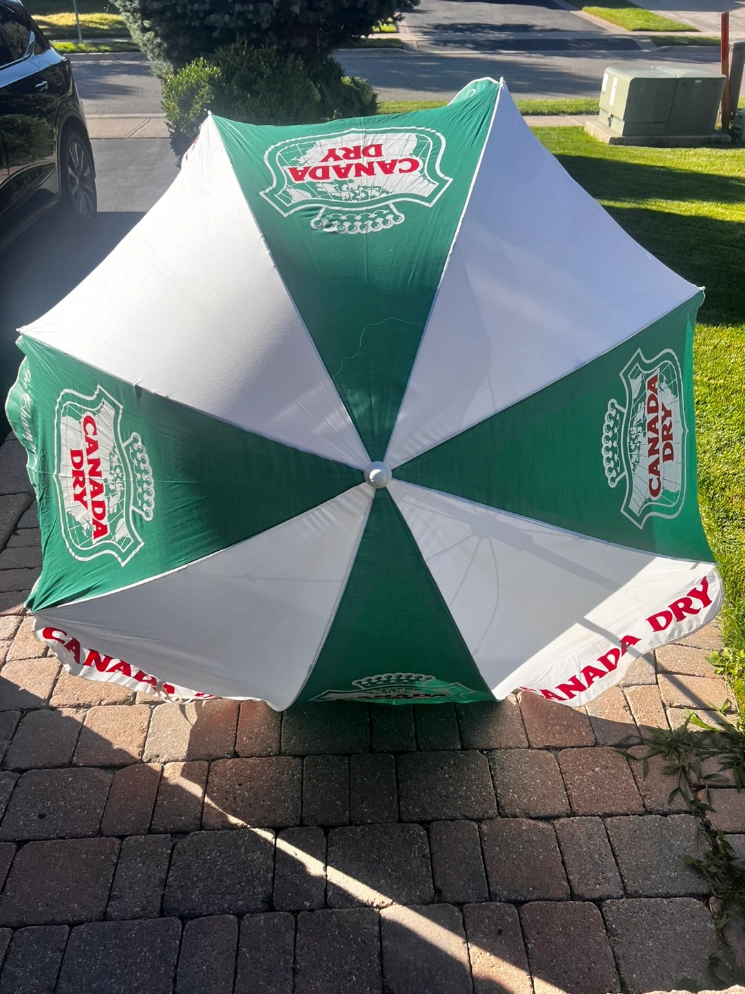 Selling a Canada Dry patio umbrella. It's in great shape and perfect for some shade on a sunny day! The umbrella features the classic Canada Dry logo in green and white.