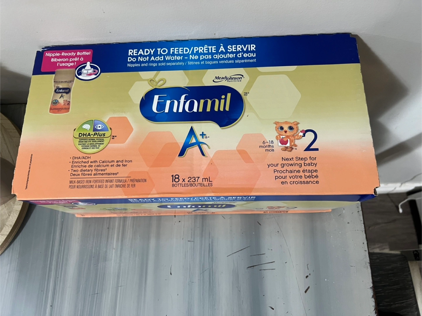 Selling a box of Enfamil A+ Stage 2 formula, perfect for your growing baby! This box contains 18 bottles, each 237ml. It's ready to feed, so no need to add water. Suitable for babies aged 6-18 months. Enriched with calcium and iron, plus DHA/ARA. The box is included!