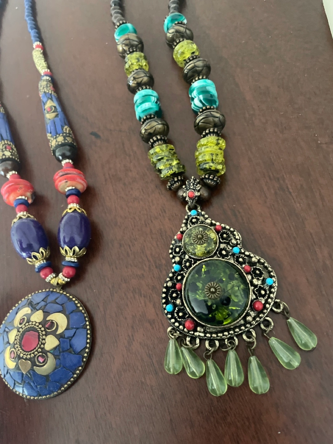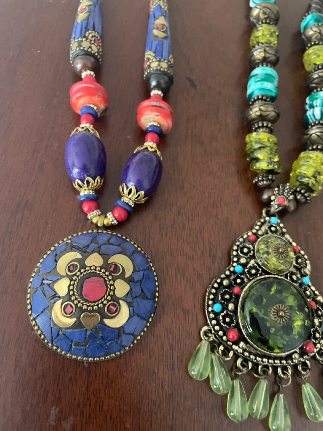 Two unique bohemian style necklaces! One features a blue mosaic pendant and colourful beads, while the other has a green stone pendant with turquoise and red accents. Perfect for adding a touch of eclectic flair to any outfit