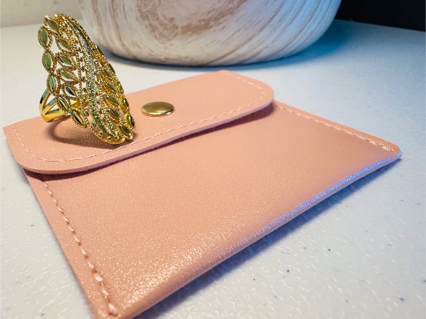 Selling a beautiful gold color ring. It has a unique, eye-catching design. Perfect for adding a touch of elegance to any outfit! It comes with a pouche! ✨