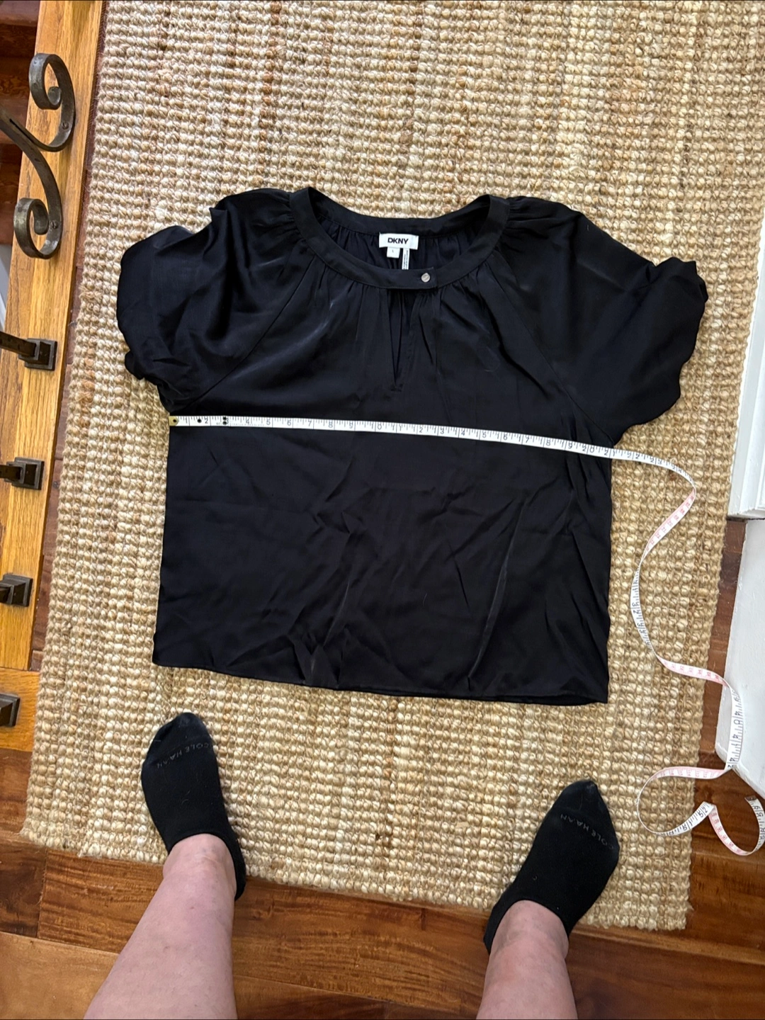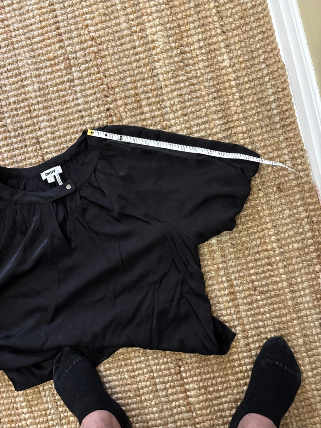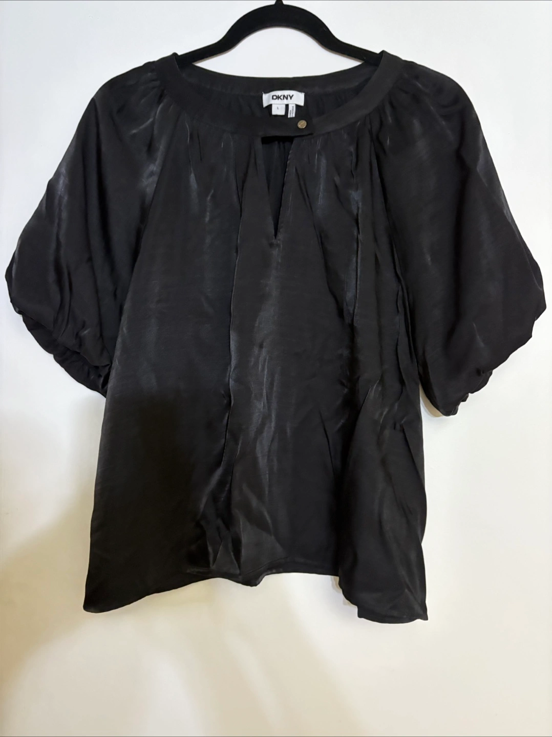 Selling a stylish DKNY blouse in black, size large. The shell is made of 53% rayon and 47% polyester. The sleeve lining is 100% polyester. It's in great condition and ready for a new home