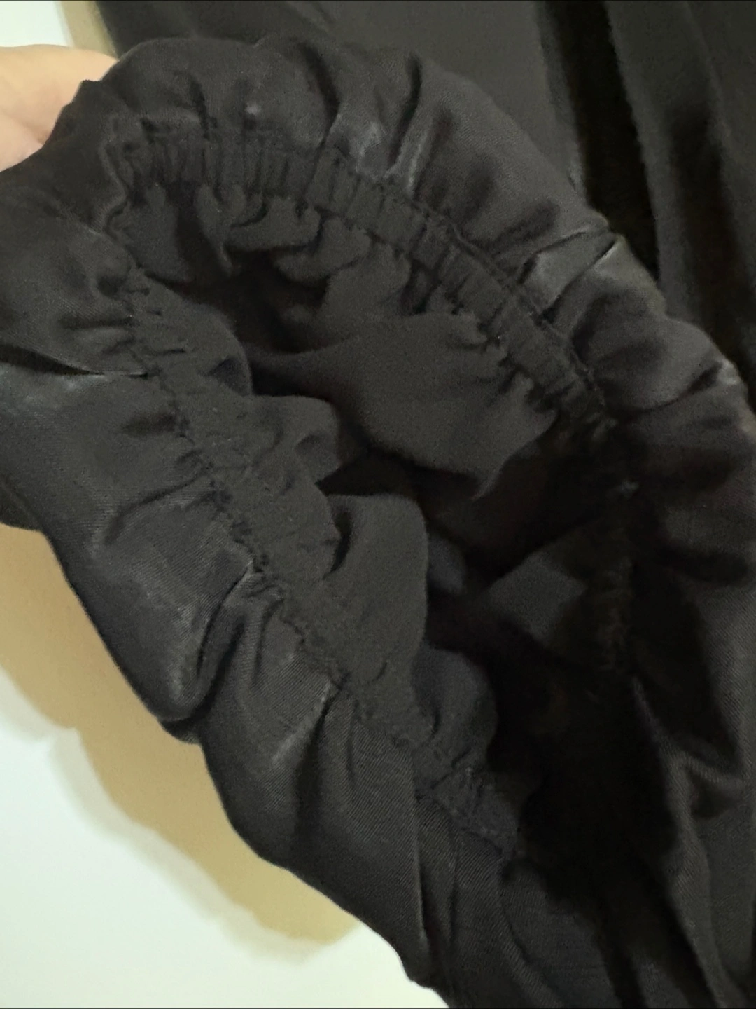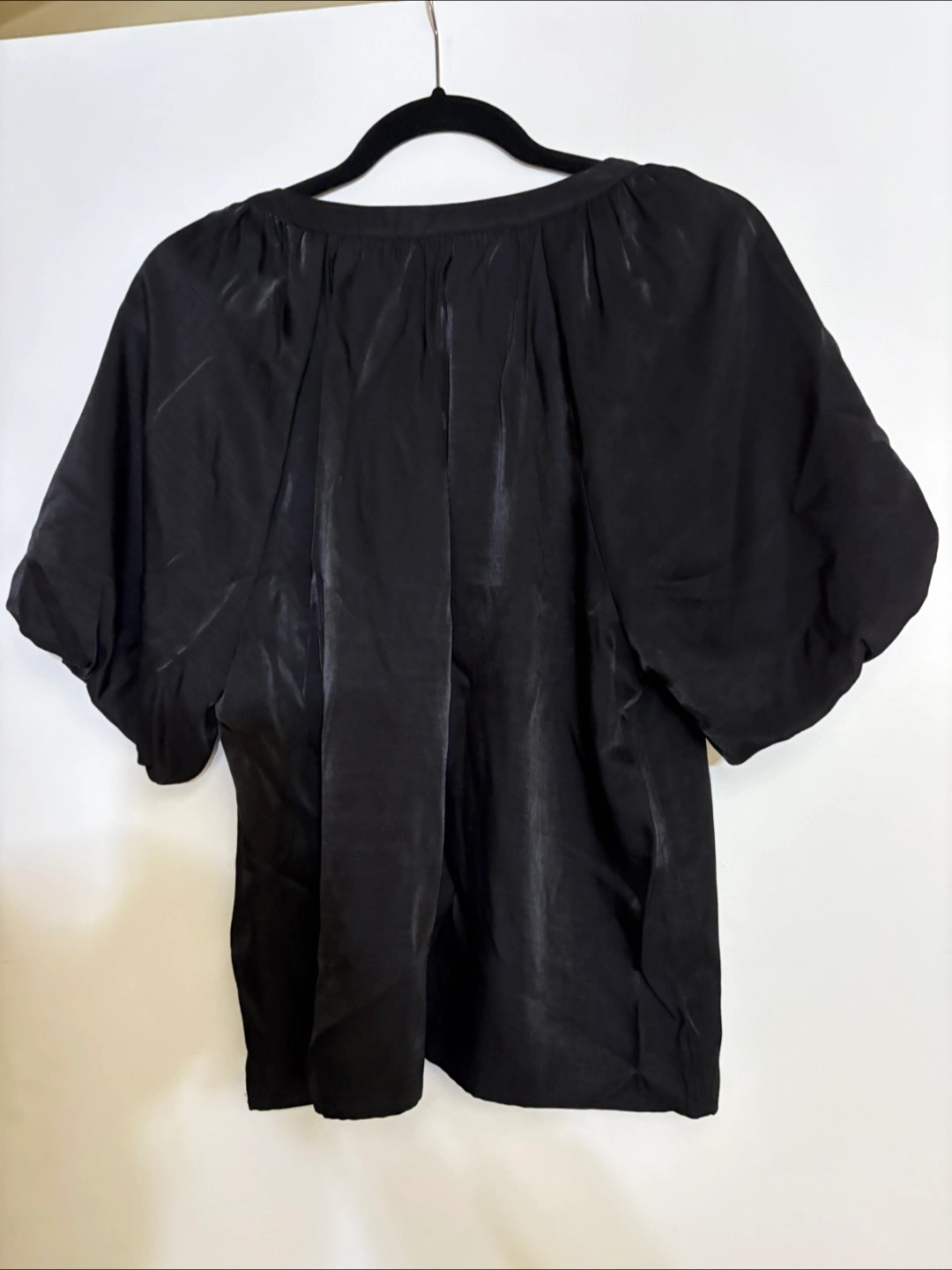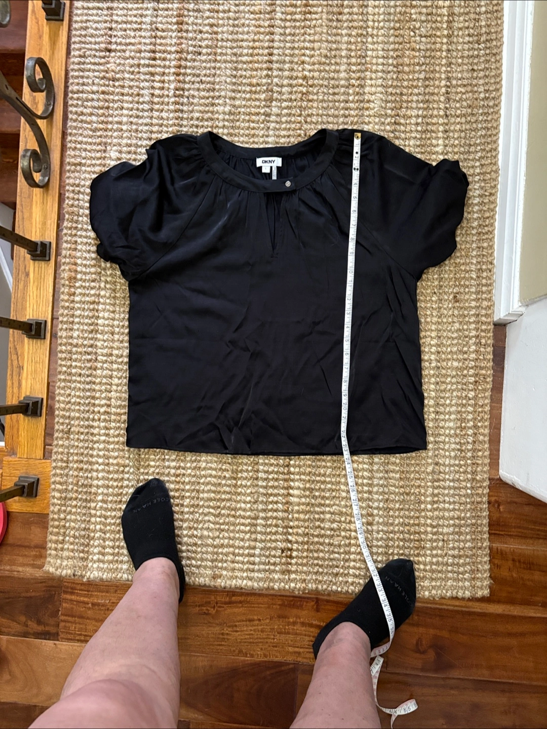 Selling a stylish DKNY blouse in black, size large. The shell is made of 53% rayon and 47% polyester. The sleeve lining is 100% polyester. It's in great condition and ready for a new home