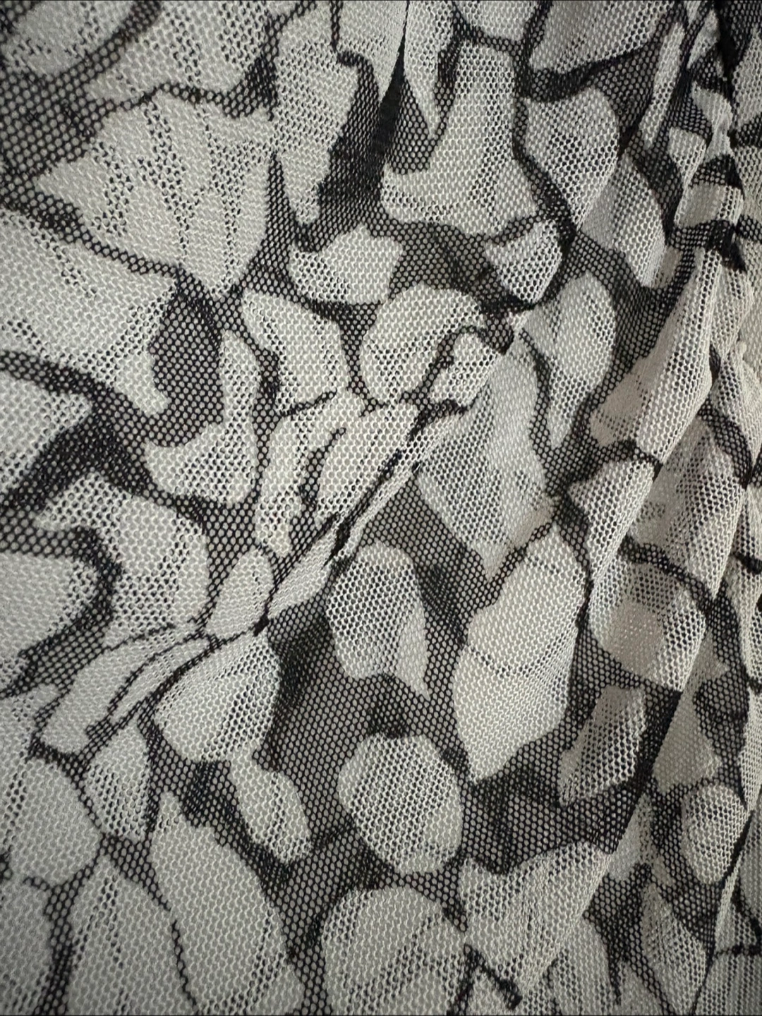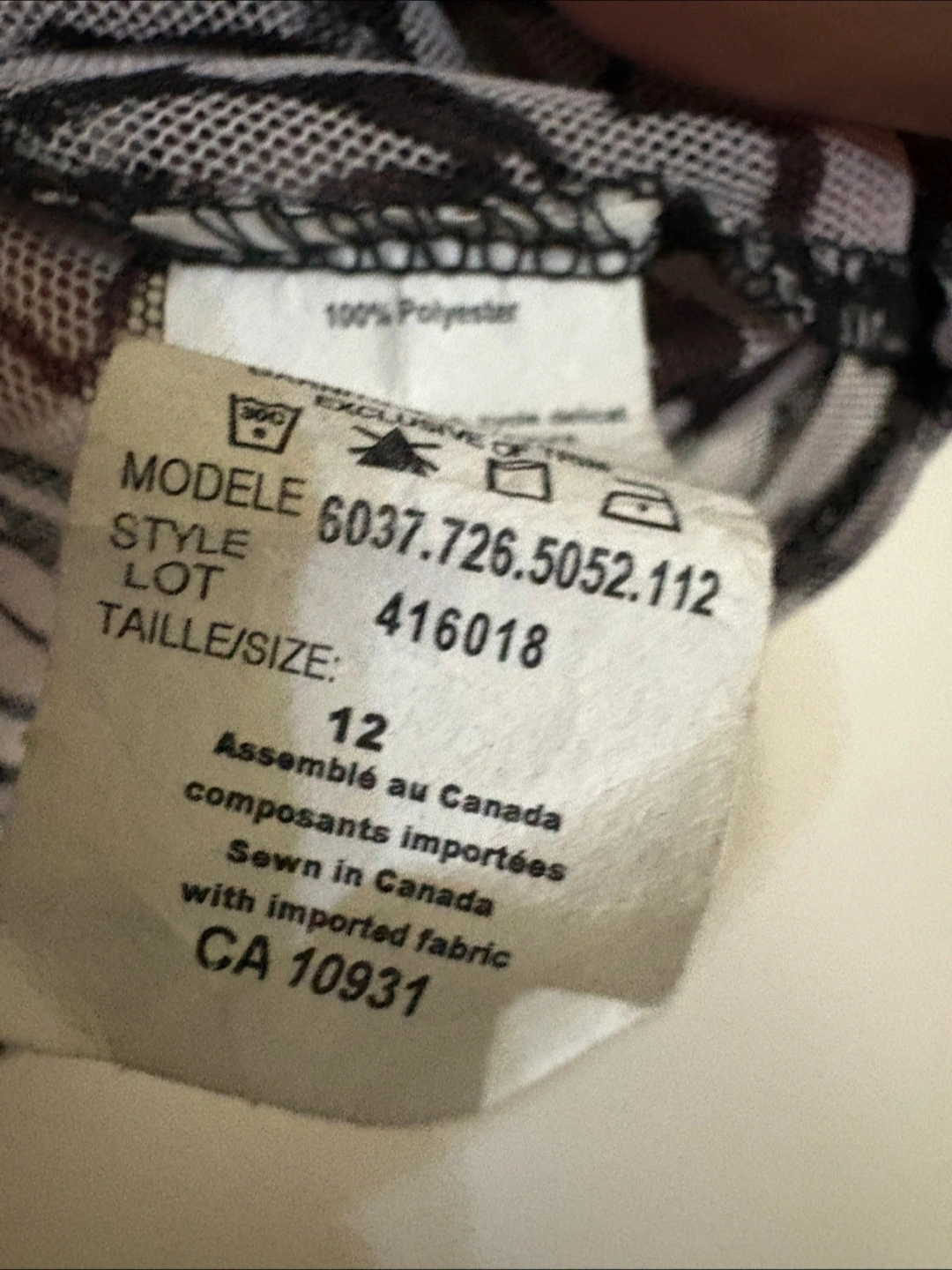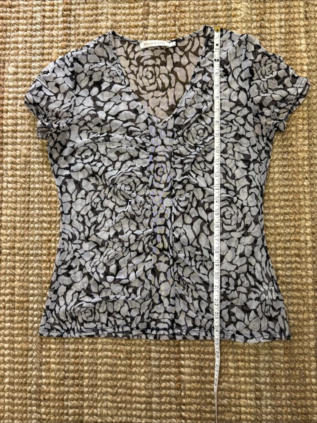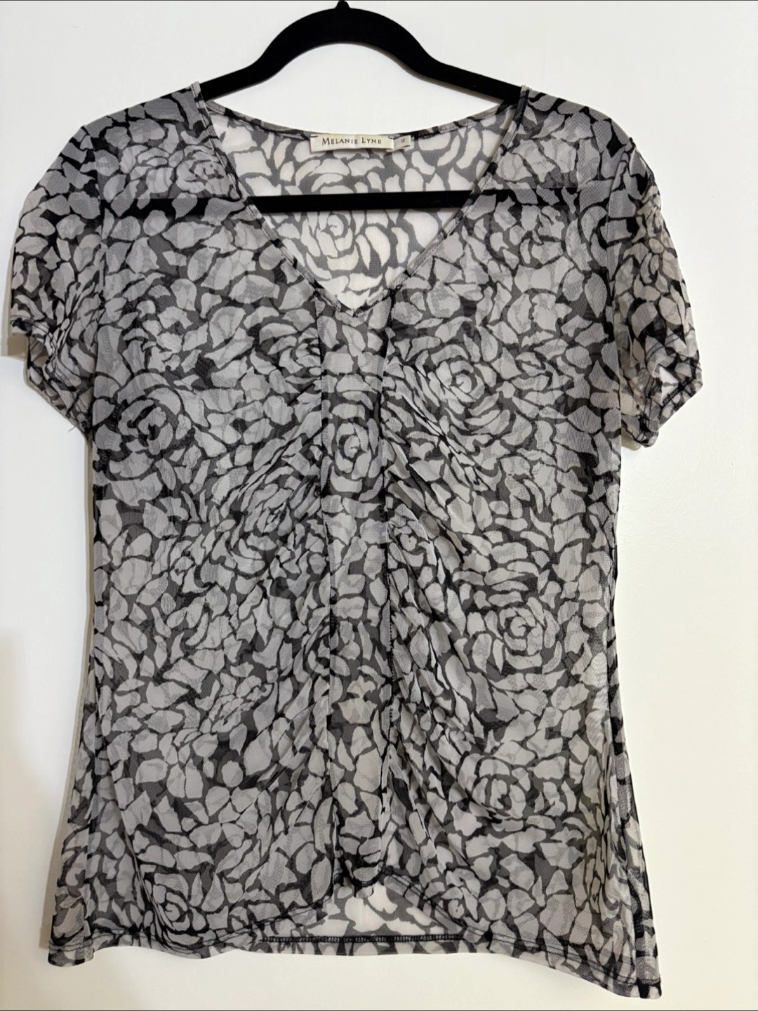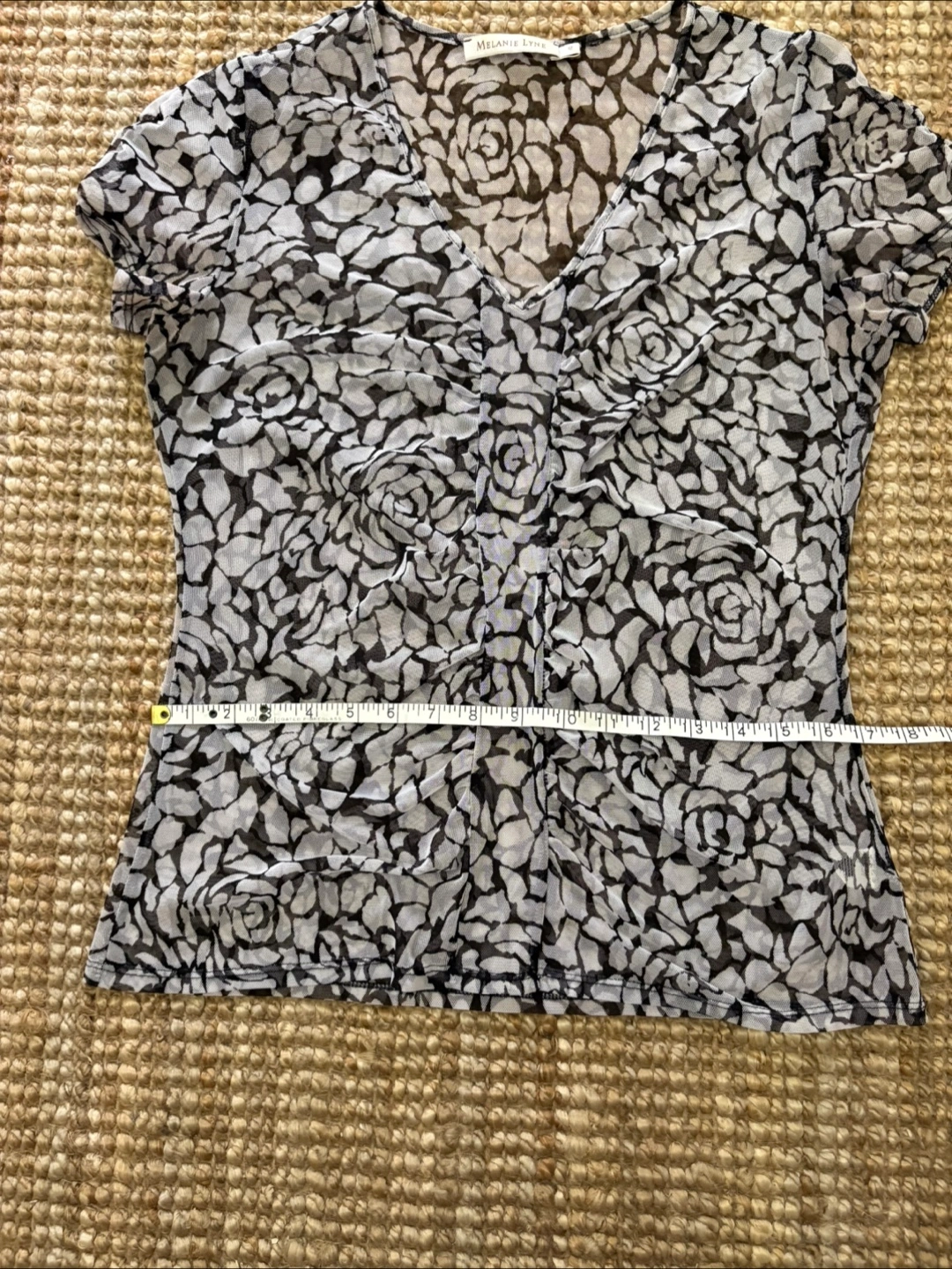 This is a Melanie Lyne blouse in size 12. It features a stylish black and white floral-like pattern. The blouse is made of 100% polyester, making it lightweight and comfortable. Perfect for a casual or dressed-up look!