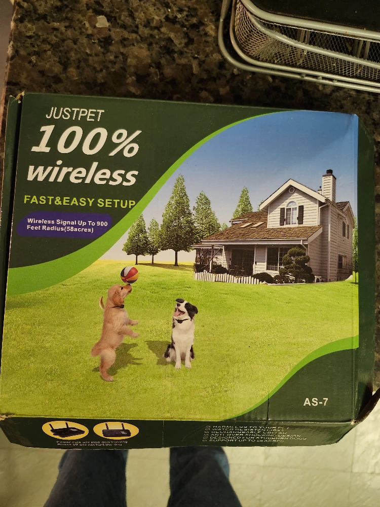 Selling a JUSTPET 100% wireless dog fence, perfect for keeping your furry friends safe! This set is designed for two dogs and features a fast and easy setup. It has a wireless signal range of up to 900 feet (58 acres). The original price was $119.00. Box included!