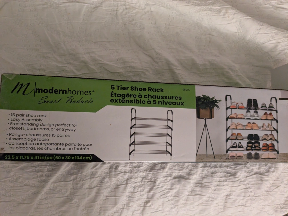 Selling a brand new Modernhomes 5 Tier Shoe Rack still in its original packaging! This shoe rack is perfect for keeping your closet, bedroom, or entryway organized. It's designed to hold up to 15 pairs of shoes and is easy to assemble. The dimensions are 23.5 x 11.75 x 41 inches (60 x 30 x 104 cm)