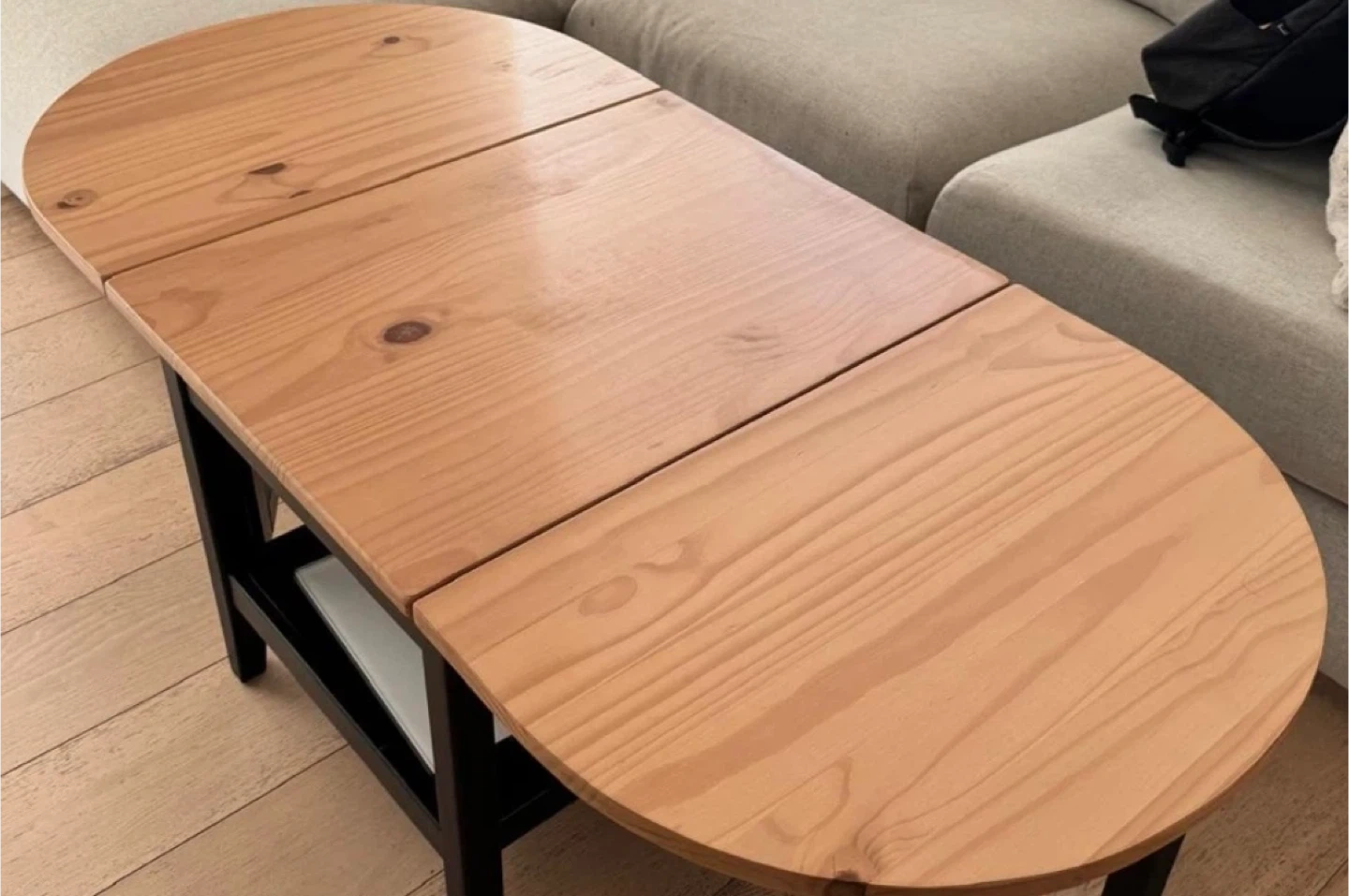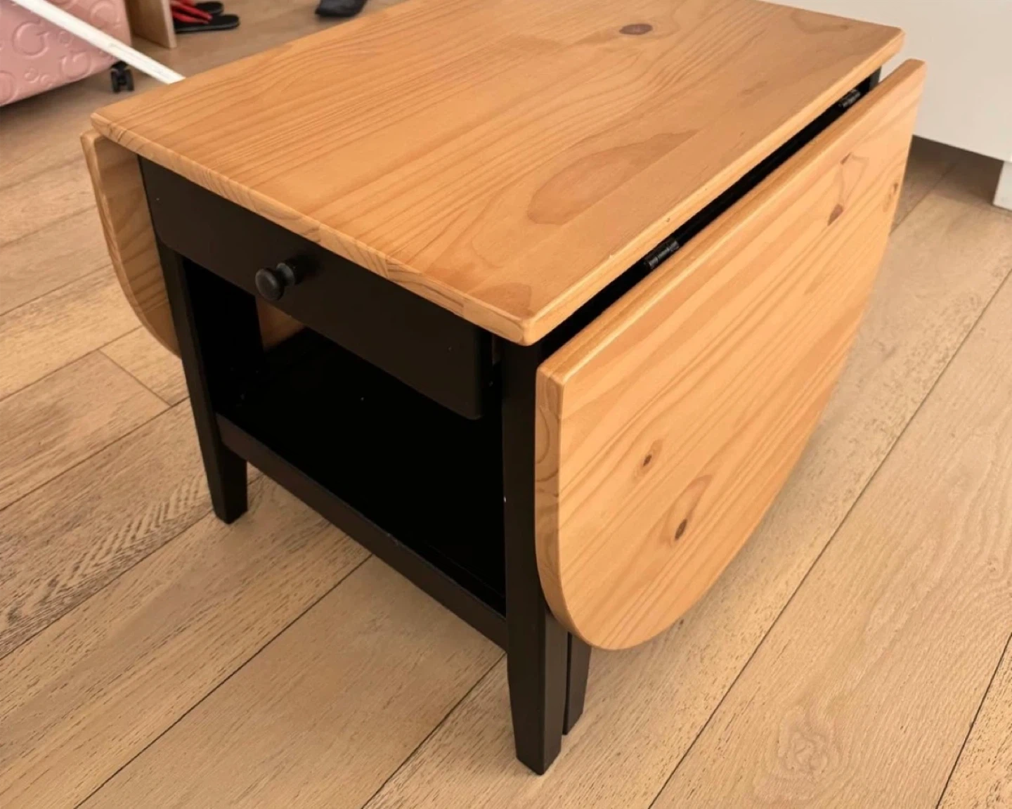 Selling a lovely drop leaf coffee table! It's in great shape and would be a nice addition to any living room. The wood top and black legs give it a modern look, plus the drop leaf design is super handy for saving space or expanding when you need more surface area.