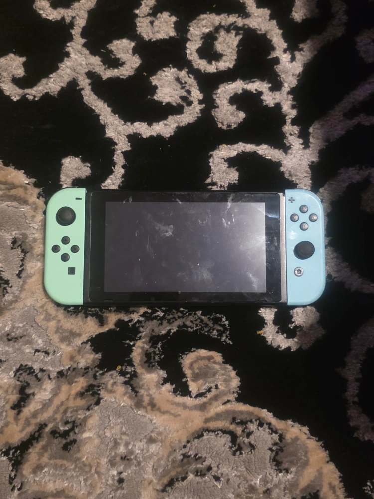 Selling a Nintendo Switch console with the blue and green joy-cons. It's in used condition with some signs of wear. Perfect for gaming on the go or at home!