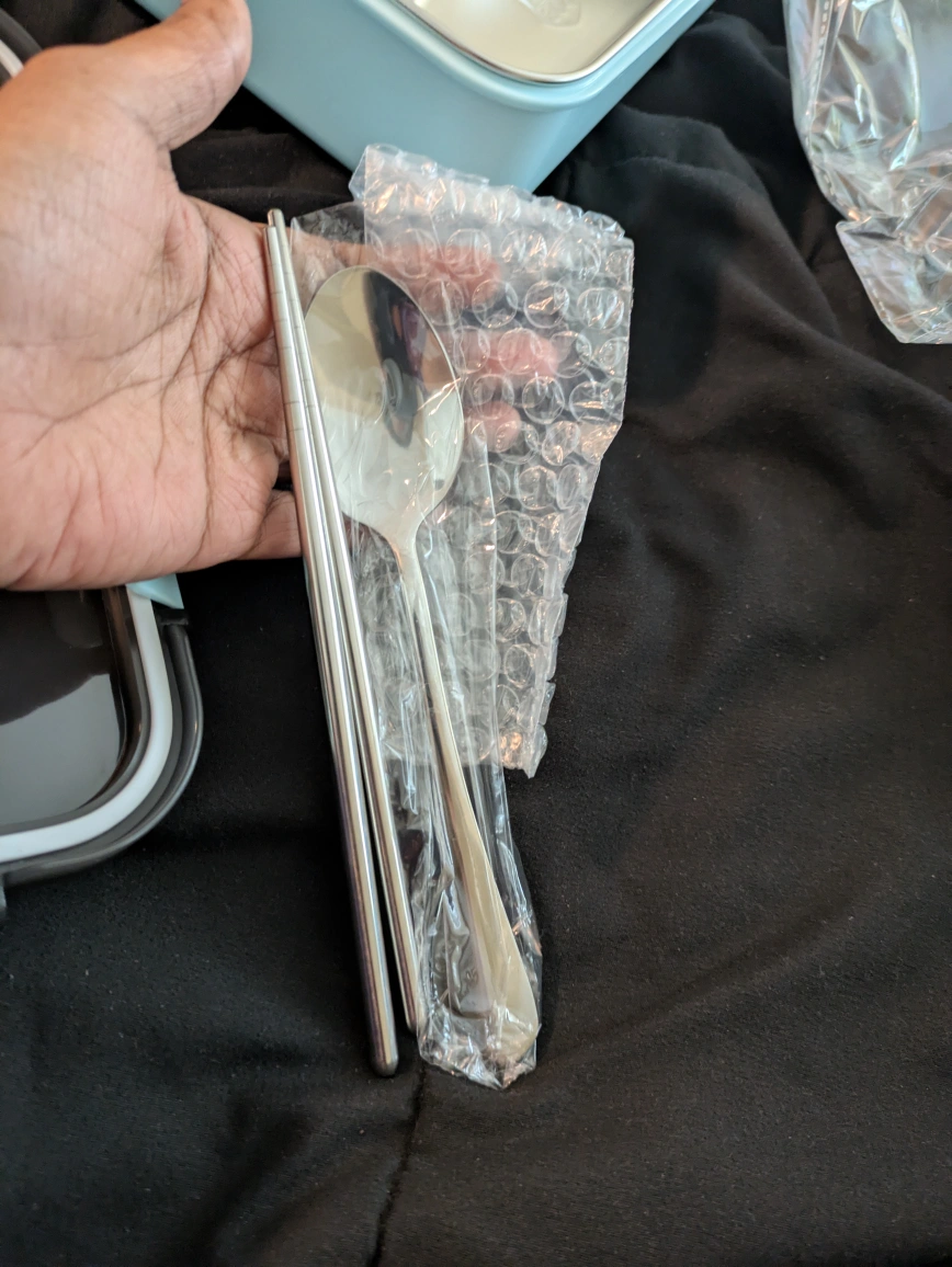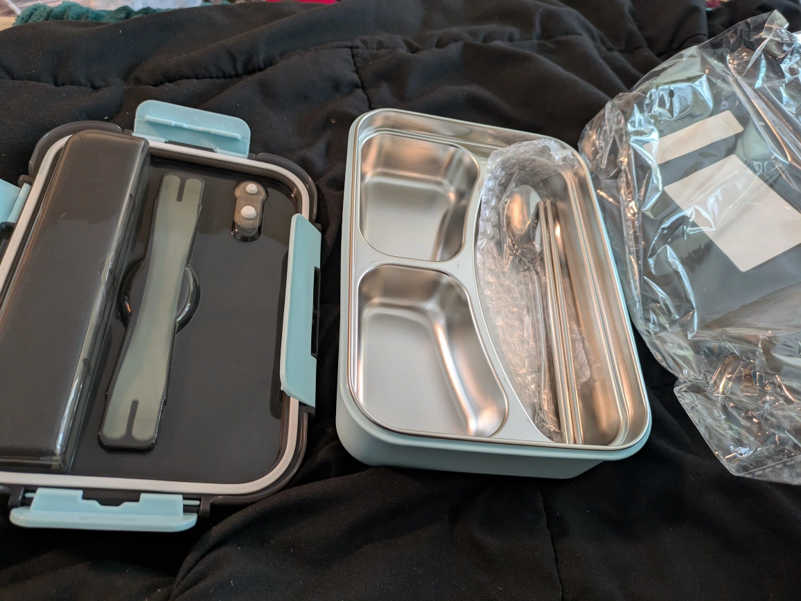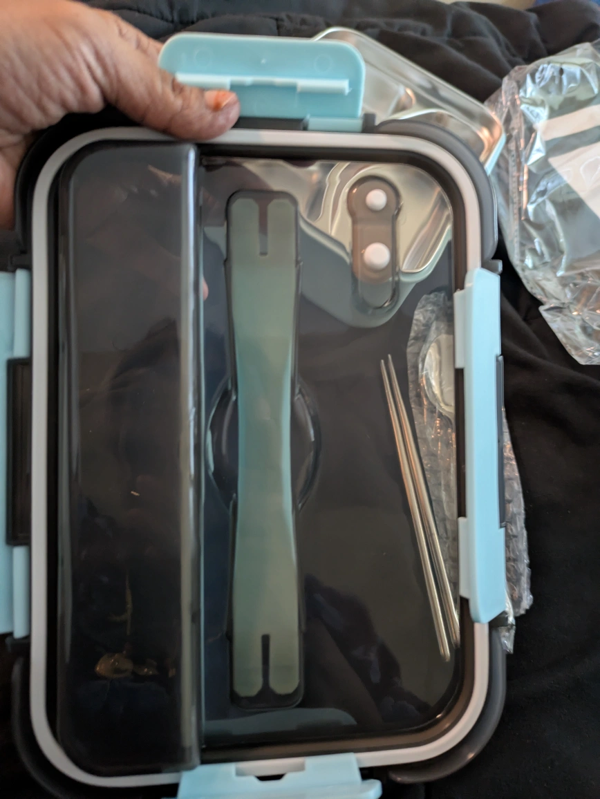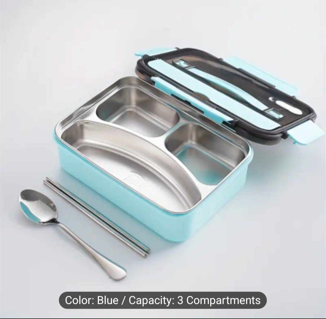 This lunch box is perfect for taking your meals on the go! It features a stainless steel interior with 3 compartments to keep your food separate. The exterior is a nice blue colour, and the box measures approximately 24cm x 17.5cm x 7.5cm. It also has a handle for easy carrying