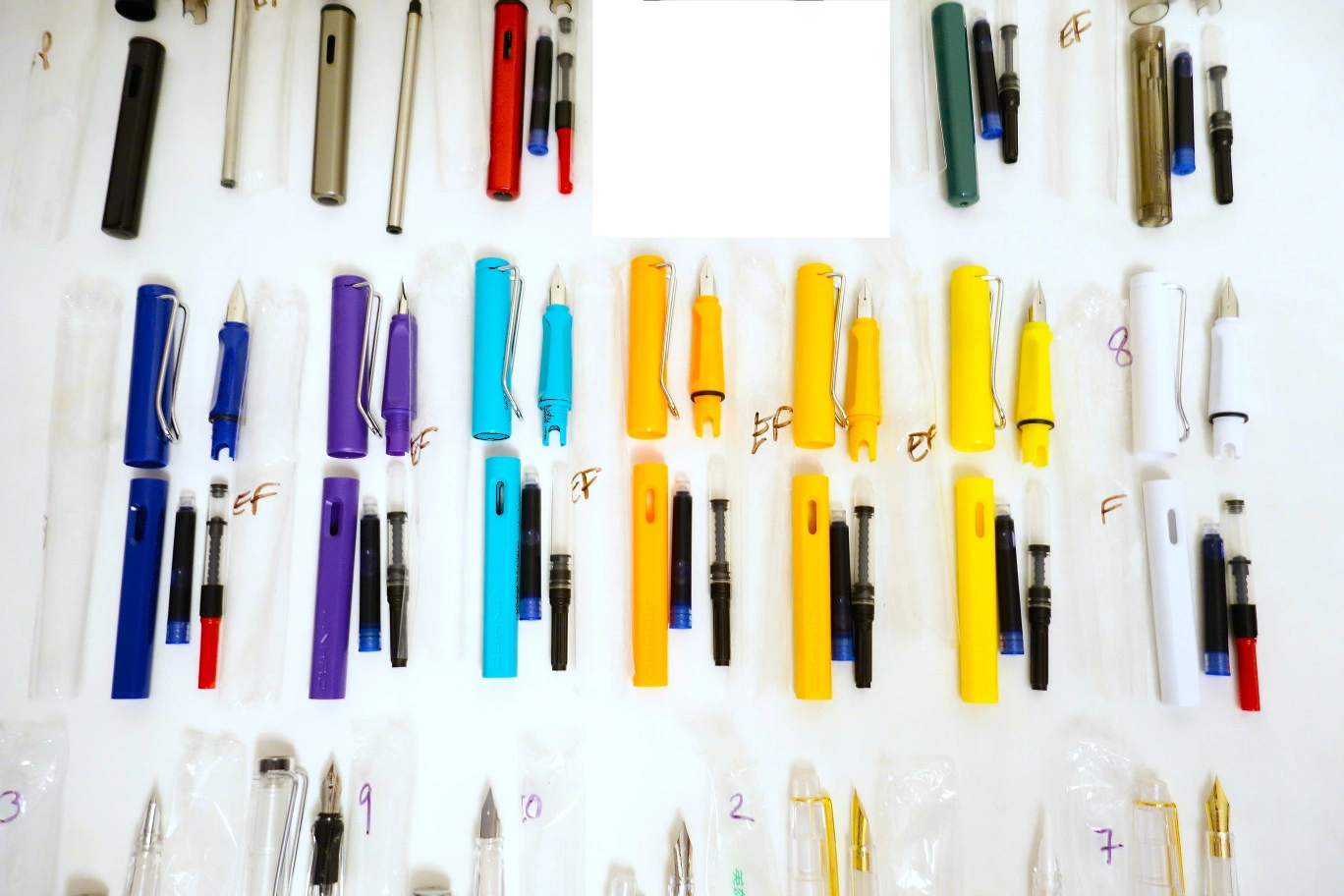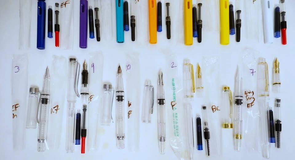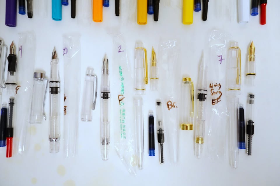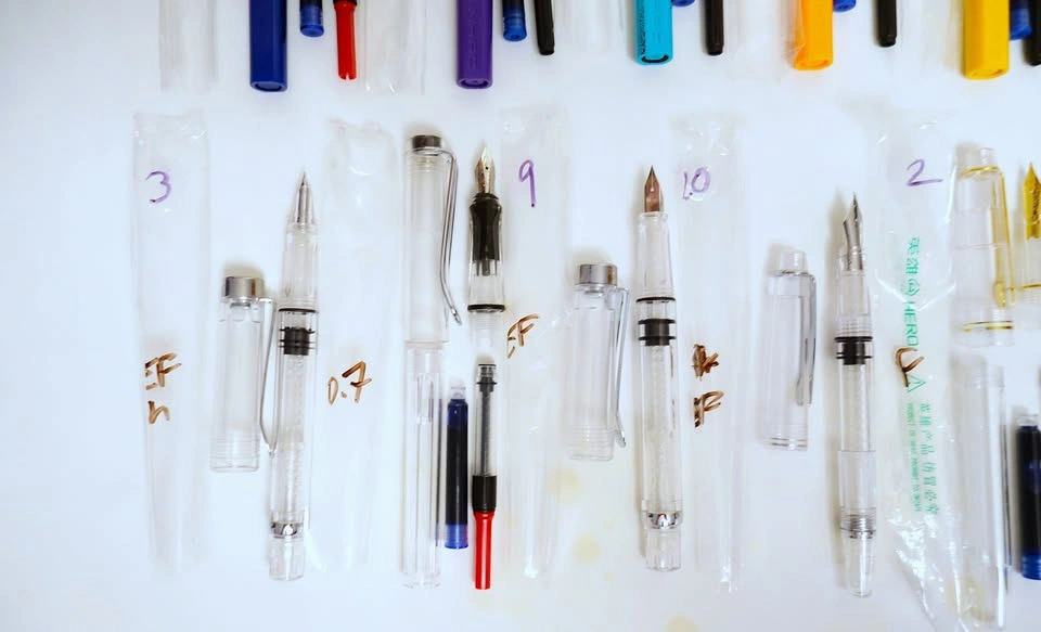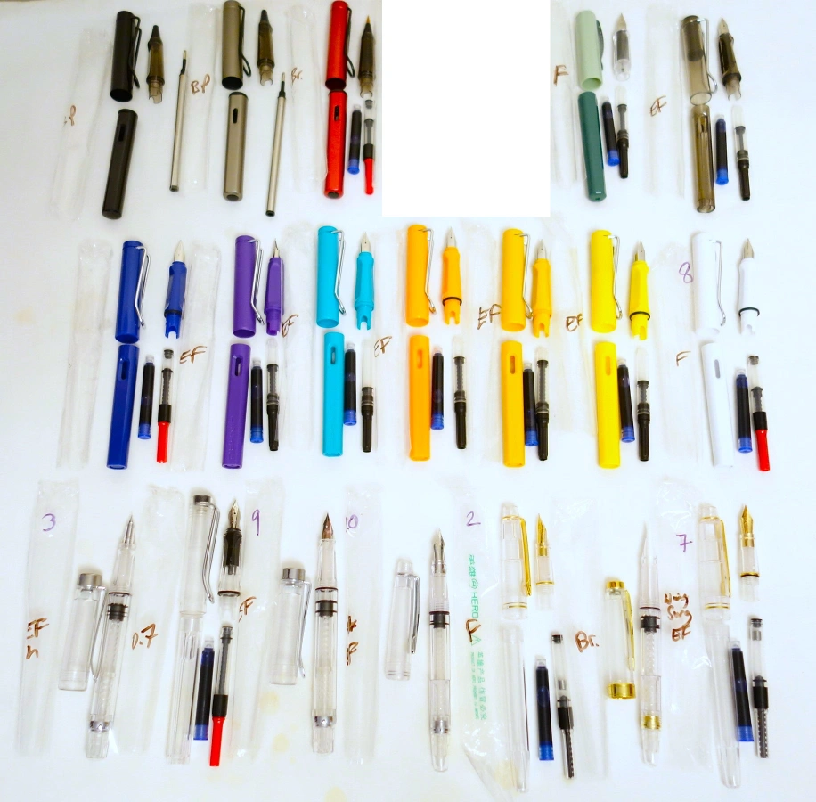 I've got an assortment of brand new pens for sale, mostly fountain with a few brush and refillable ballpoint pens mixed in. Most of the pens in the top and middle rows are fountain pens done in the LAMY Safari style. The pens in the bottom row are clear demonstrators. All of the pens are manufactured by Jinhao (although a few are unbranded), with the exception of two in the bottom row, which are made by Hero and Wing Sung.