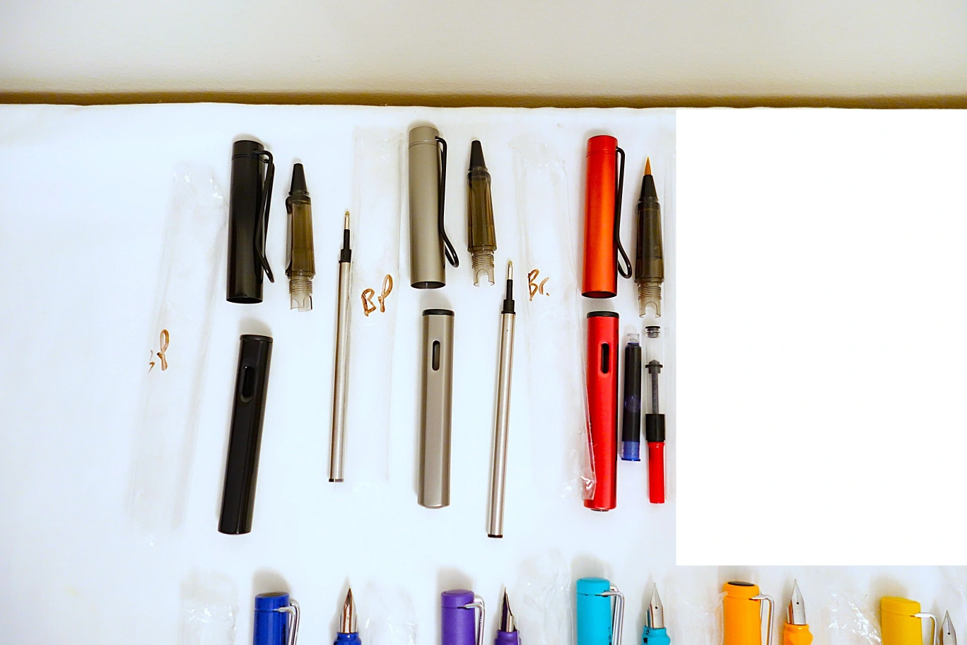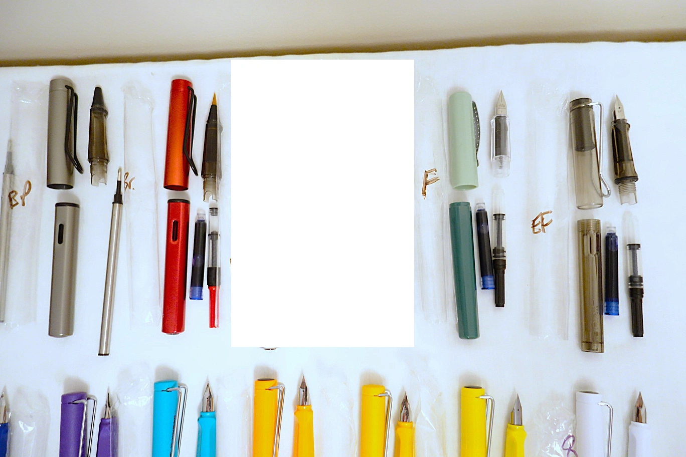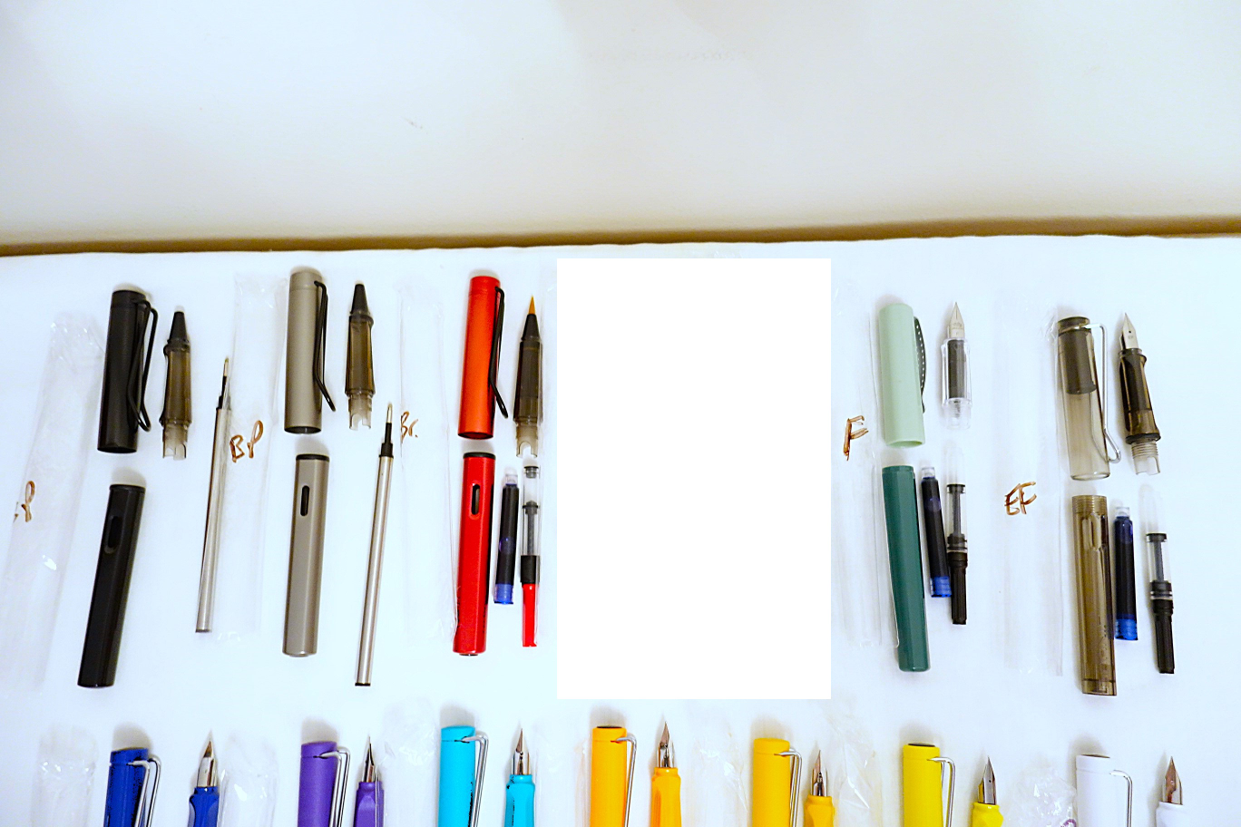 I've got an assortment of brand new pens for sale, mostly fountain with a few brush and refillable ballpoint pens mixed in. Most of the pens in the top and middle rows are fountain pens done in the LAMY Safari style. The pens in the bottom row are clear demonstrators. All of the pens are manufactured by Jinhao (although a few are unbranded), with the exception of two in the bottom row, which are made by Hero and Wing Sung.