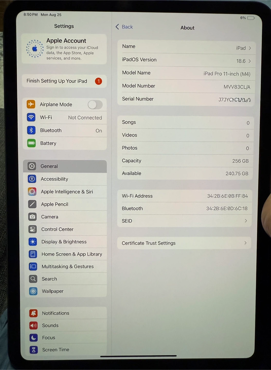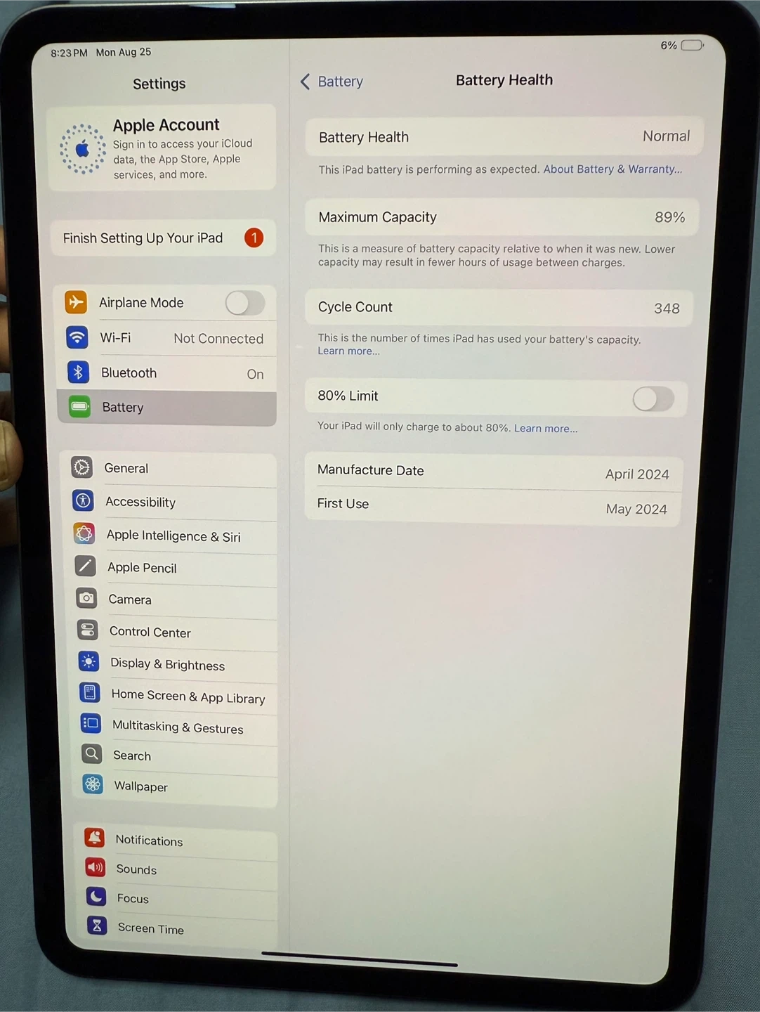 Selling an Apple iPad Pro 11-inch (M4) with 256GB of storage. The battery health is normal, with a maximum capacity of 89% and a cycle count of 348.