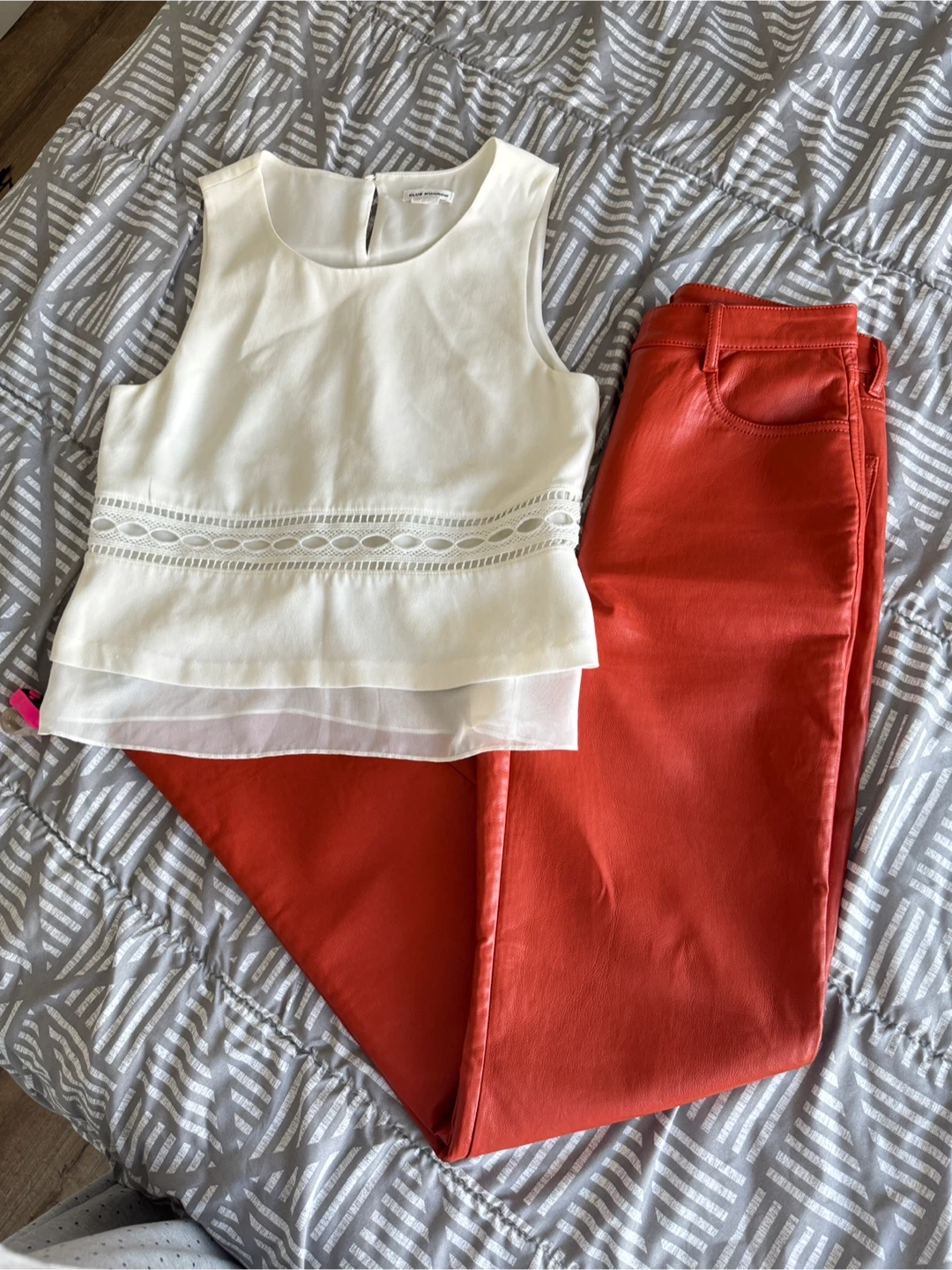 These are Wilfred's The Melina pants small size in a vibrant color . They're in great condition and ready for a new home! The unique faux leather material makes them a standout piece for any wardrobe. Perfect for adding a pop of colour and texture to your outfit comes with a club Monaco top in XS size