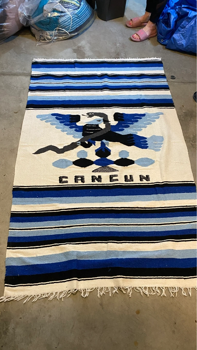 This is a woven blanket with blue, black, white, and light blue stripes. It features an eagle design and the word 'Cancun'. It has fringed edges.