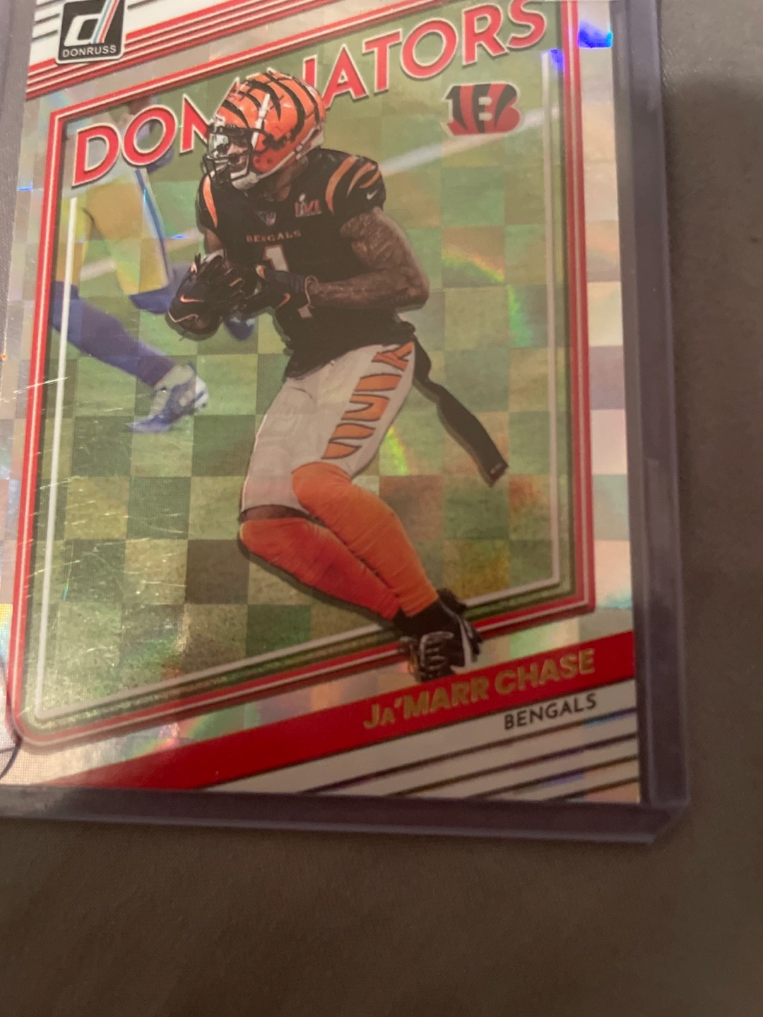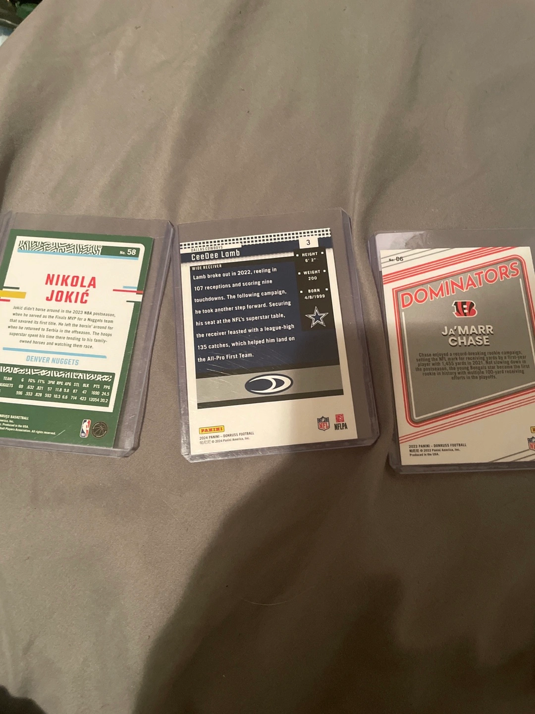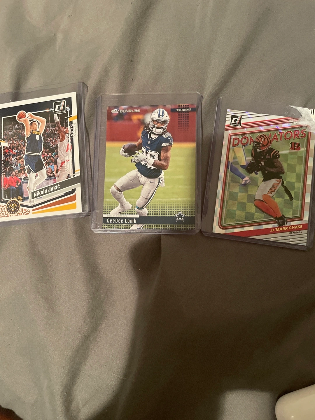 I have some Donruss trading cards for sale, featuring Nikola Jokic and Ja'Marr Chase! They're in great condition and would be a fantastic addition to any sports card collection $3 for jokic $4 for cee Dee lamb $5 for ja,marr chase $10 for all