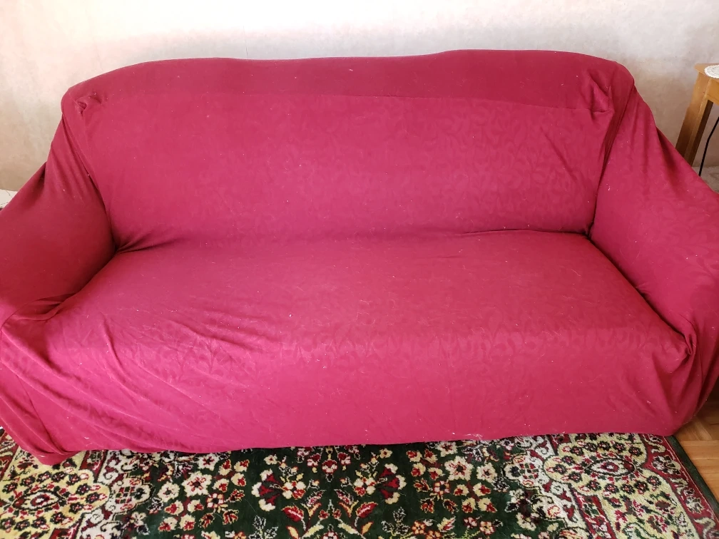 This is a Surefit sofa slipcover in red. It's made of 95% polyester and 5% spandex. It is designed to extend the life of your furniture and refresh your décor. Please note that there are some one small cut need to stitch