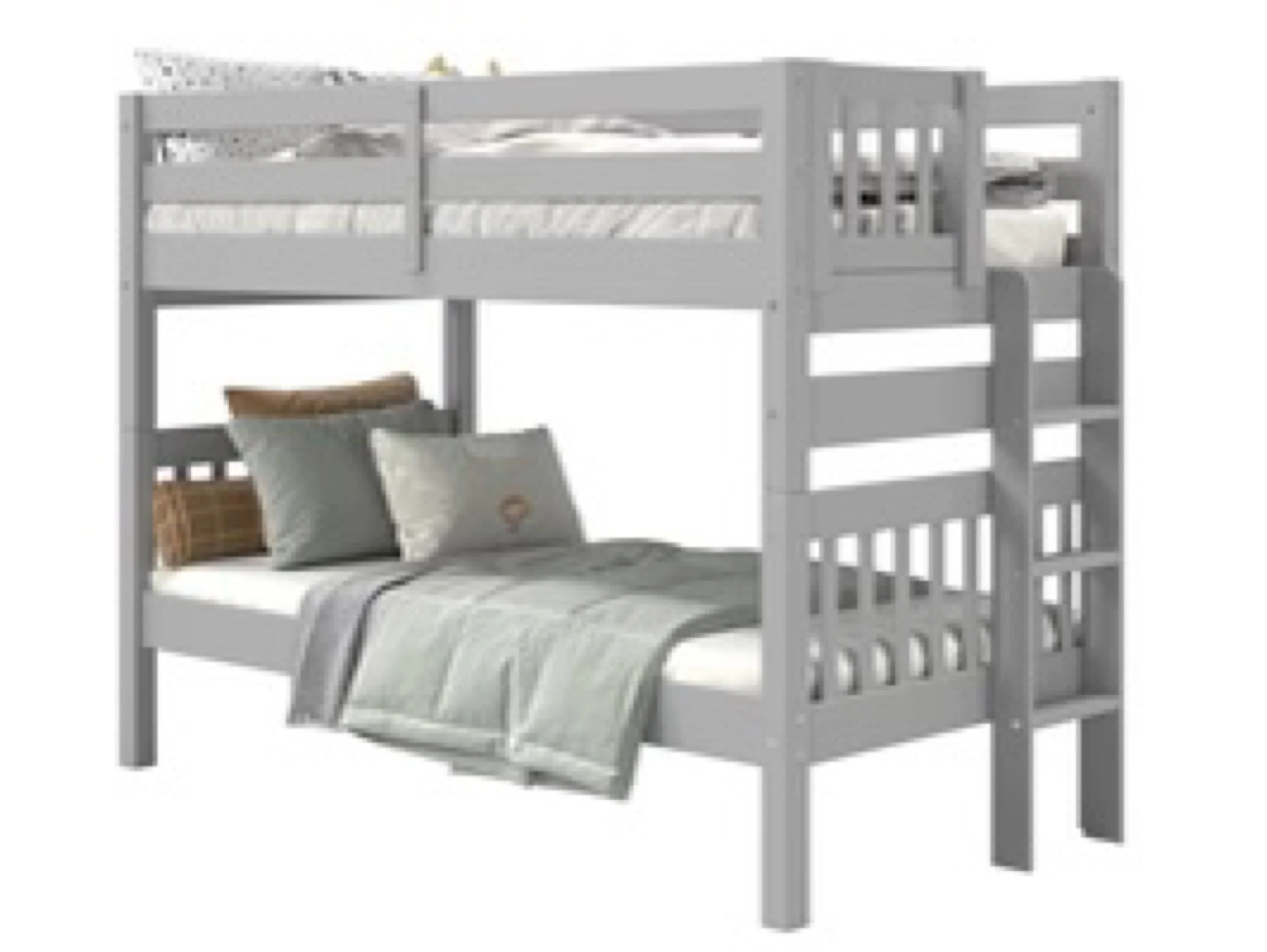 Selling a gray wooden bunk bed frame. Currently used as two separate twin beds.
