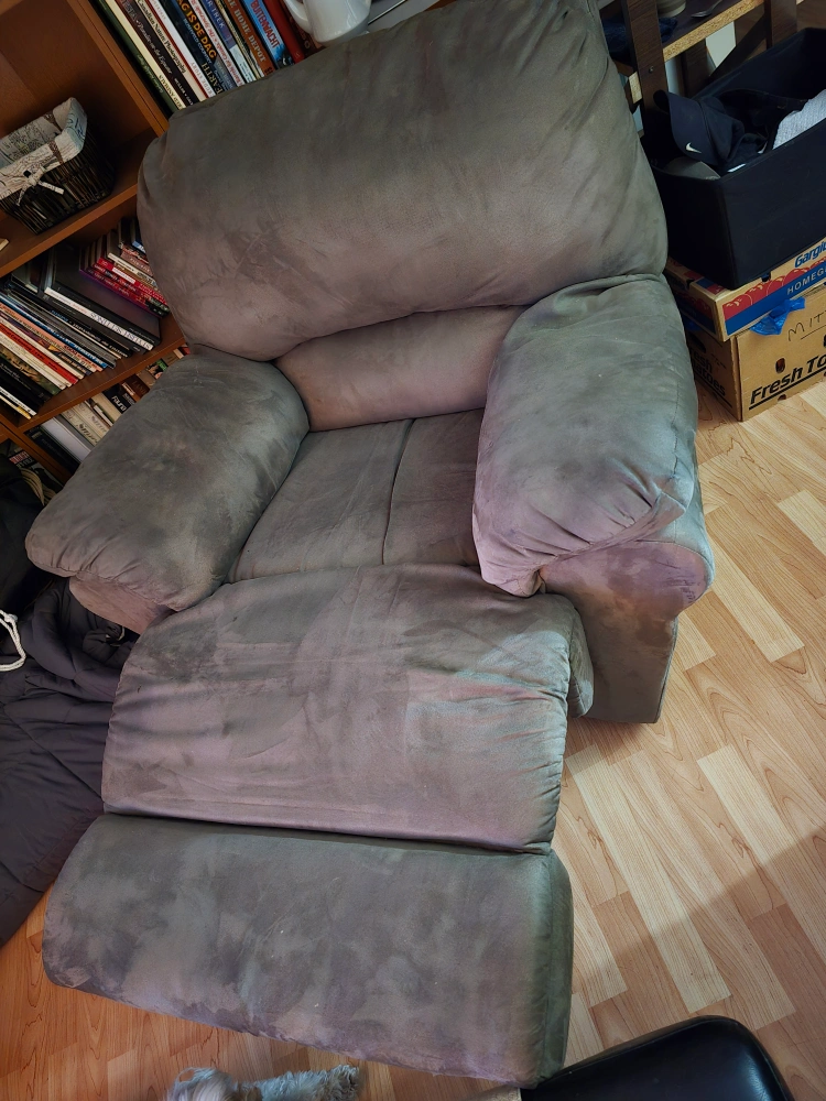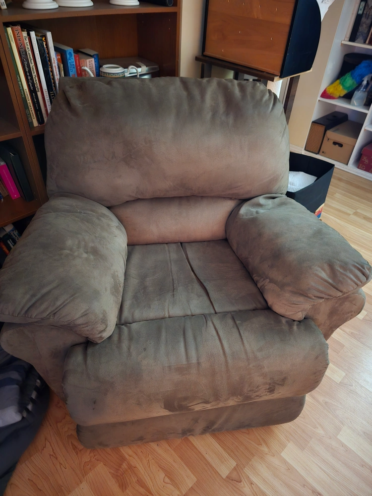 Selling a well-loved oversized recliner armchair. It's super comfy and perfect for relaxing. The material is a soft, neutral colour that would fit into any living space. It has barely been used and it's still got plenty of life left in it! This is light weight!