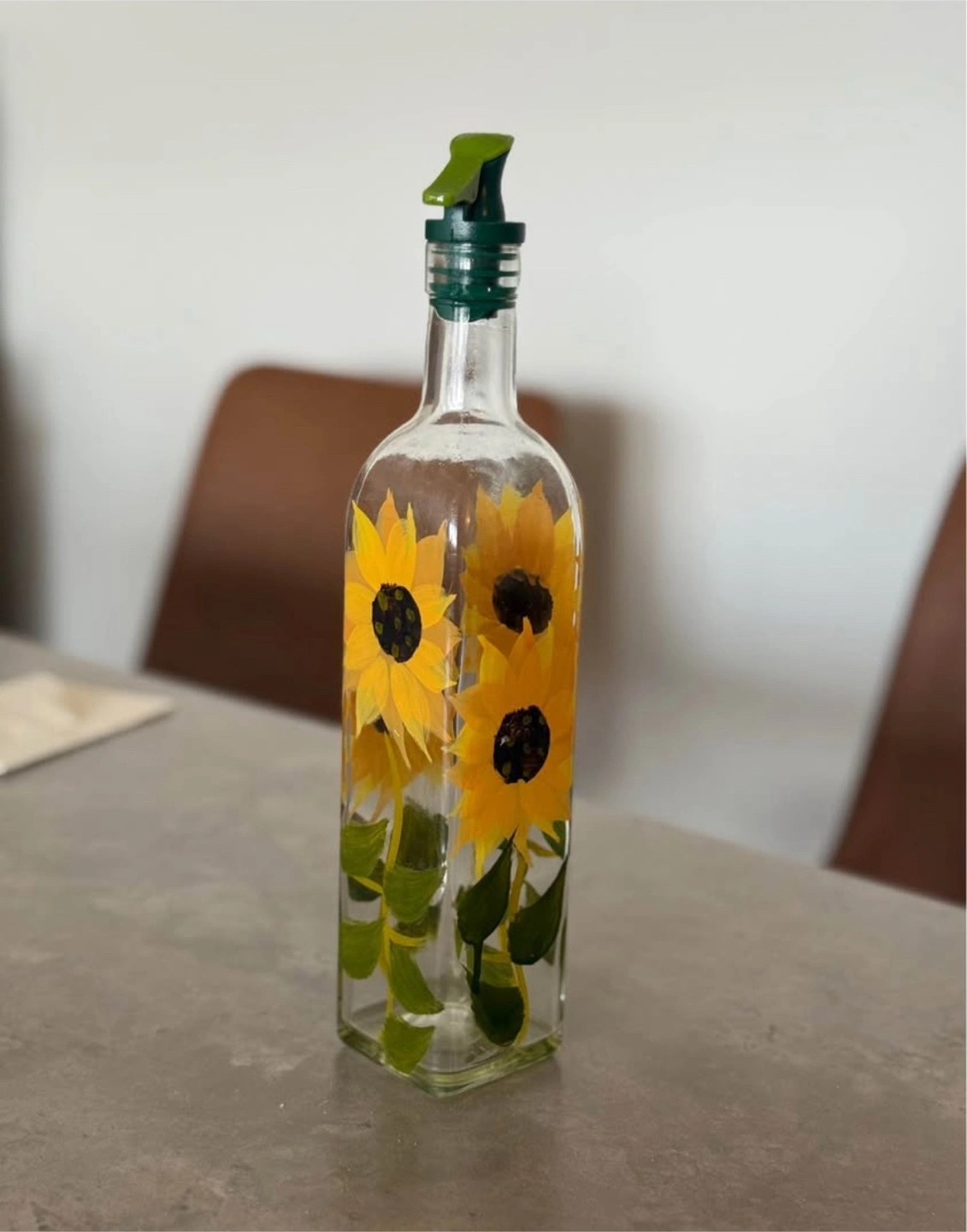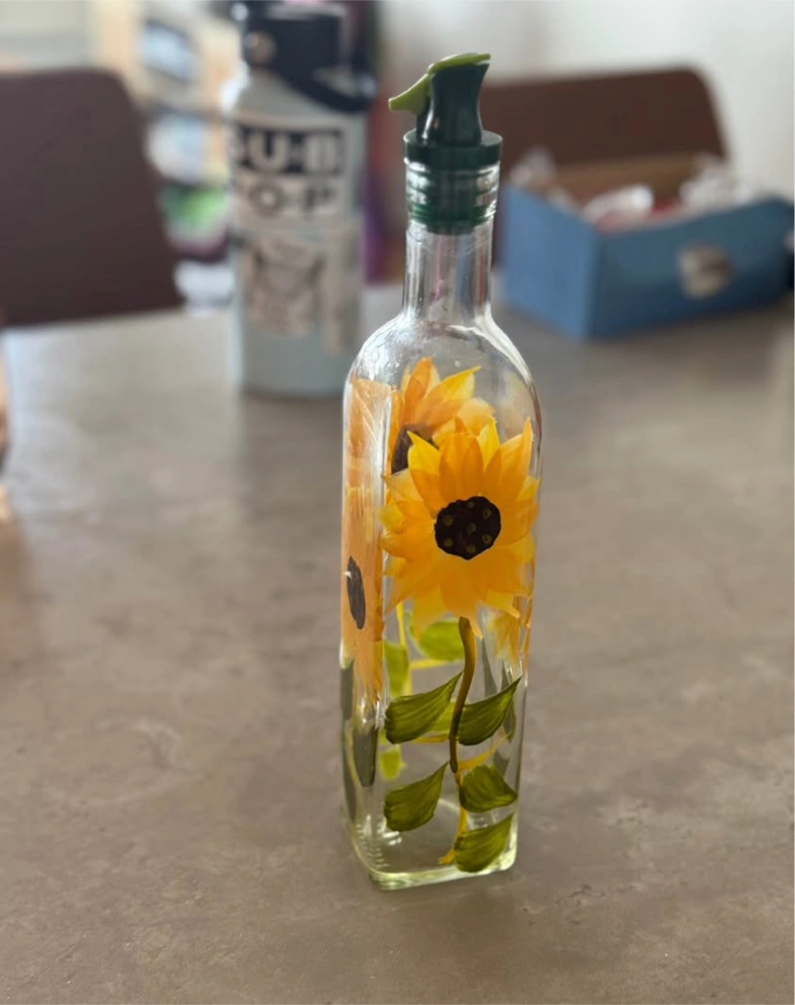 104Giving away a clear glass olive oil dispenser decorated with hand-painted sunflowers. It comes with a green pour spout.