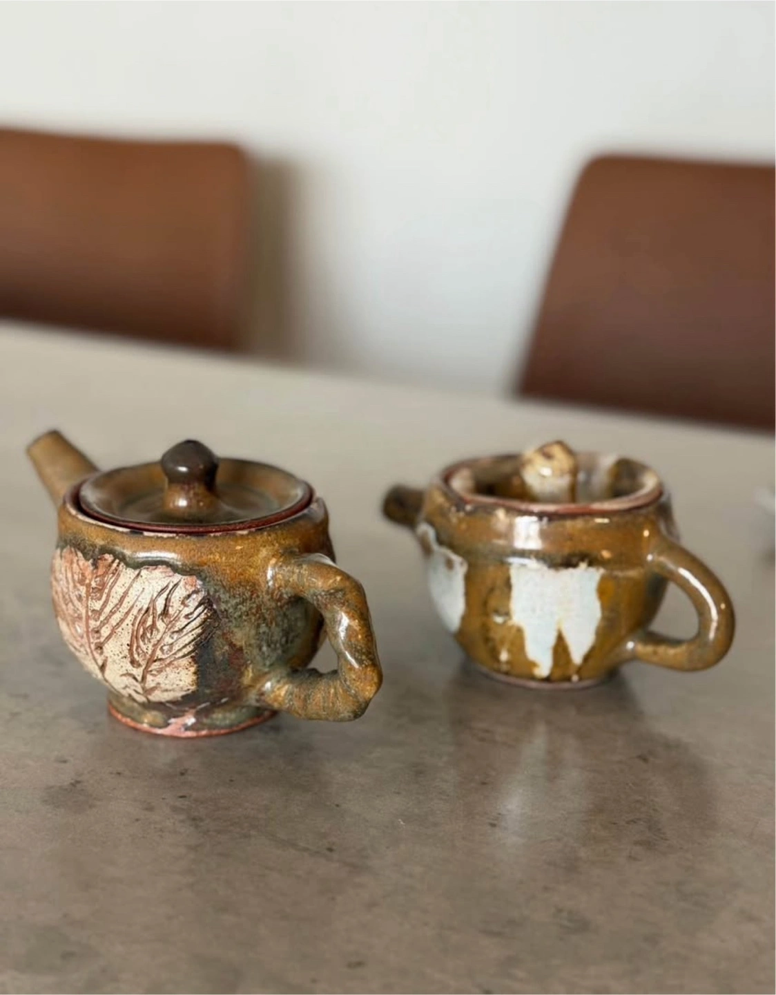 104Here's a charming ceramic teapot set! They feature a unique design and a beautiful earthy color. Perfect for tea lovers or as a decorative piece for your home