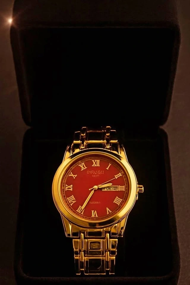 Selling a gorgeous, bold gold plated tone Barouge watch. This thing is a serious head-turner! The rich red dial with gold Roman numerals is a sharp look. It features the day and date. Comes in the original box, perfect for a gift or just treating yourself! Looks/Style: Classic, luxurious, but still makes a statement.