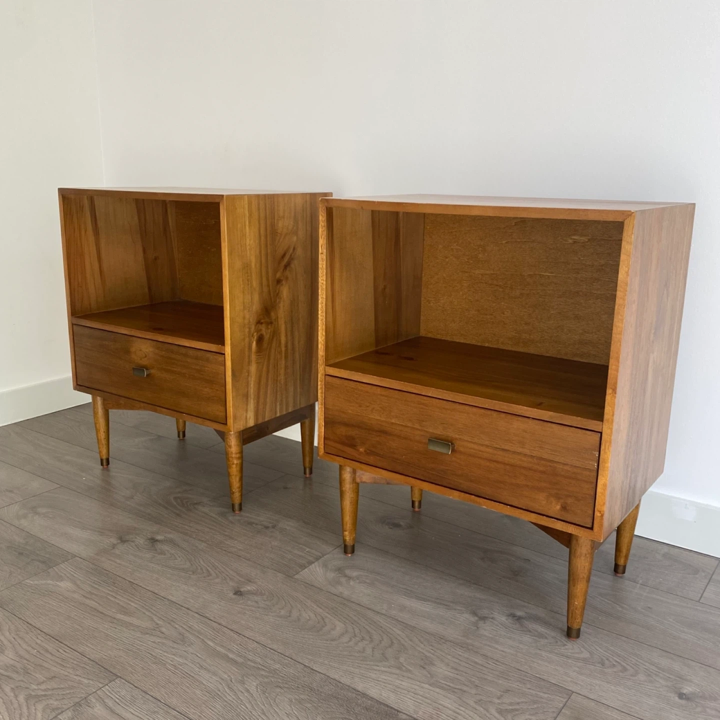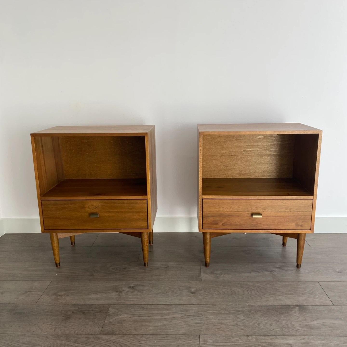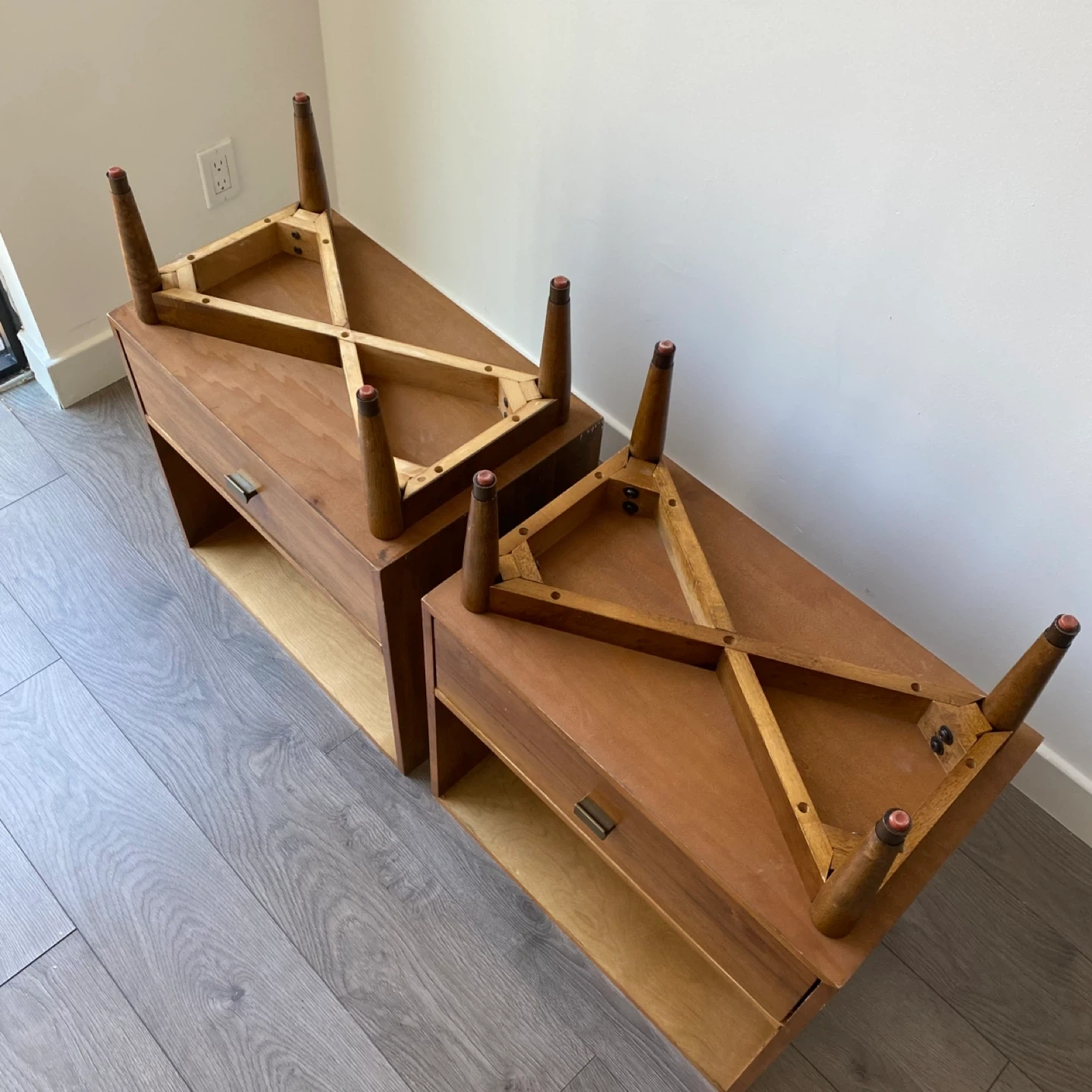 615Pick up only in Leslieville (Queen and Pape) Check out other listings! Teak night stands. $450 for both. Well made and sturdy. There are some minor scratches but in overall great condition. Width 22" Height 28" Depth 14"