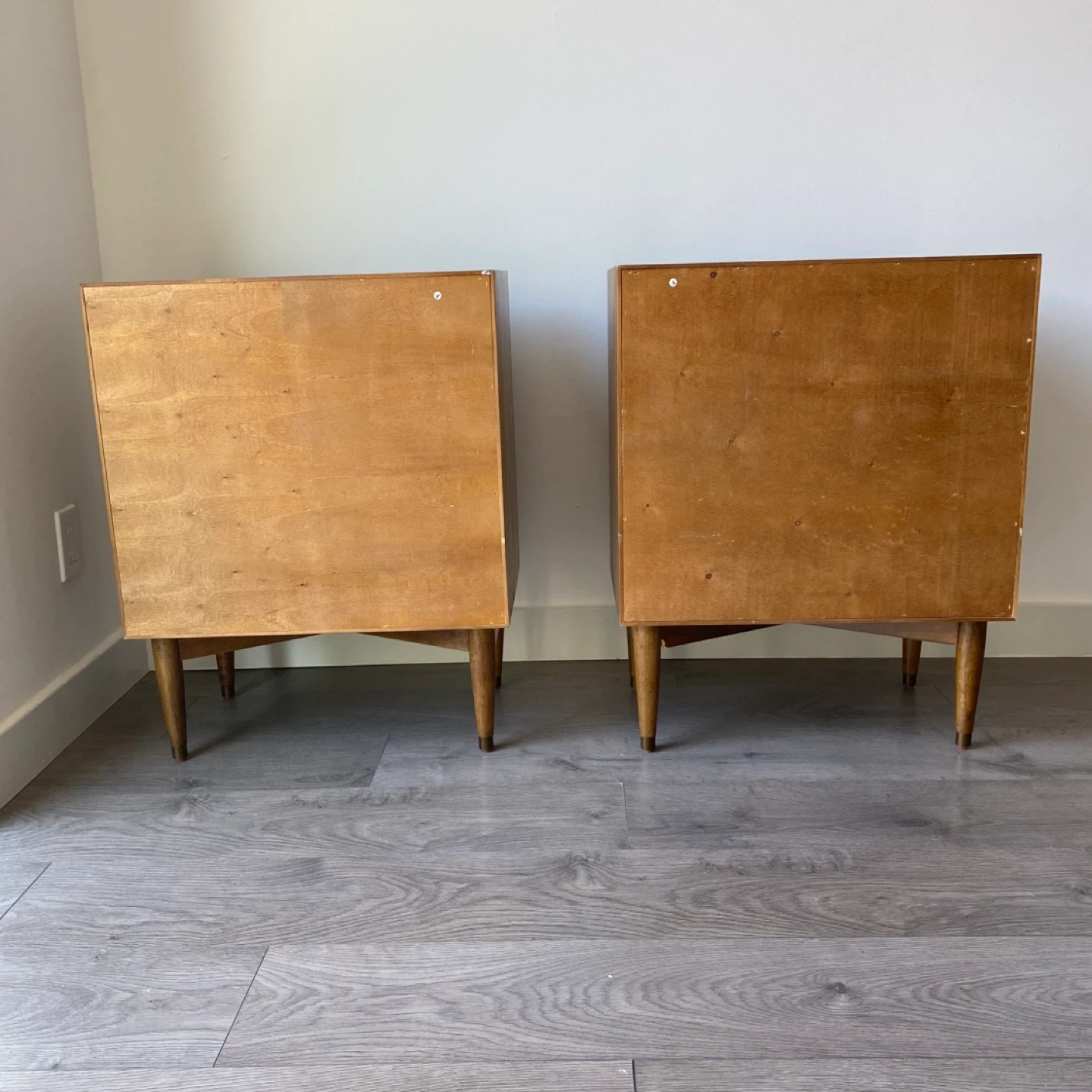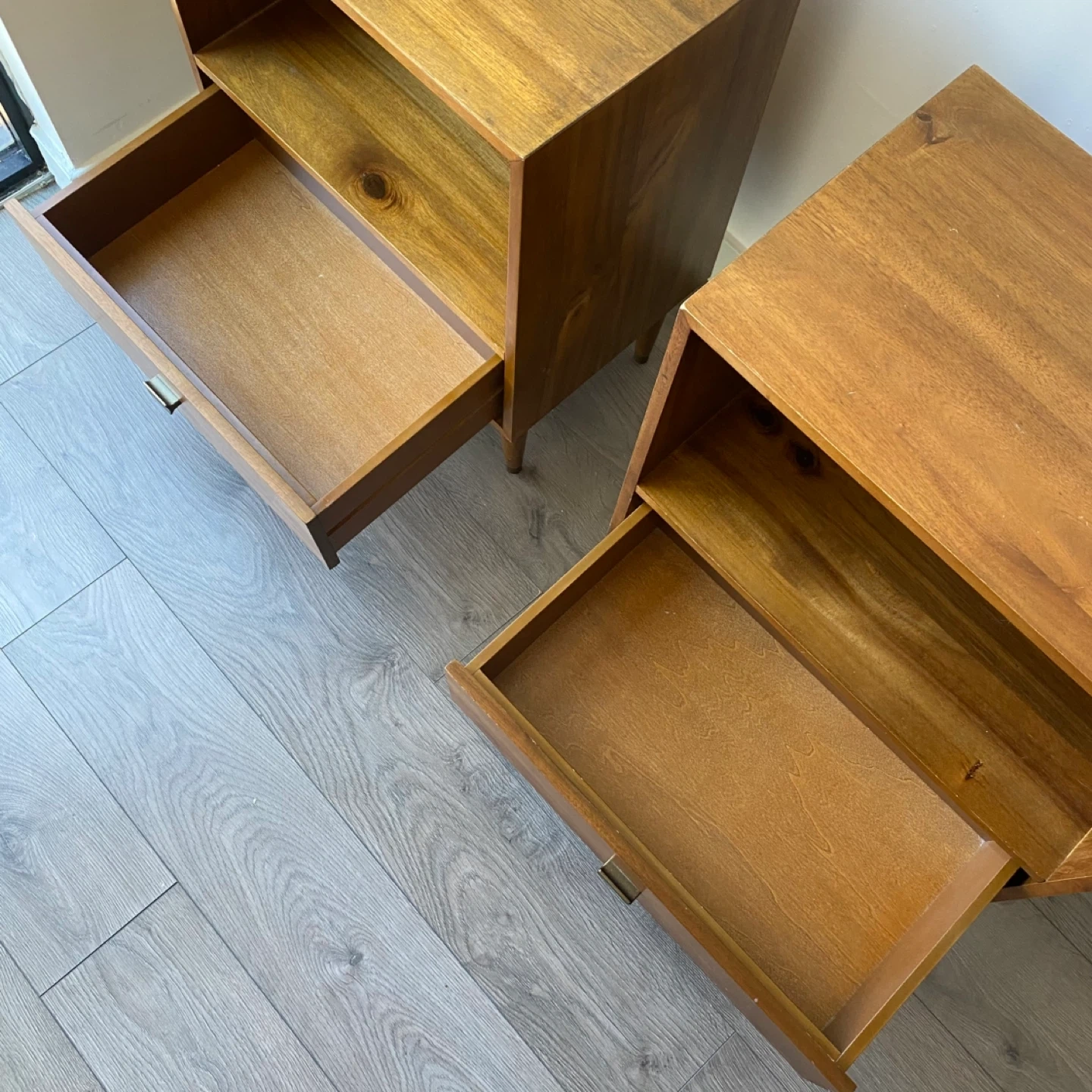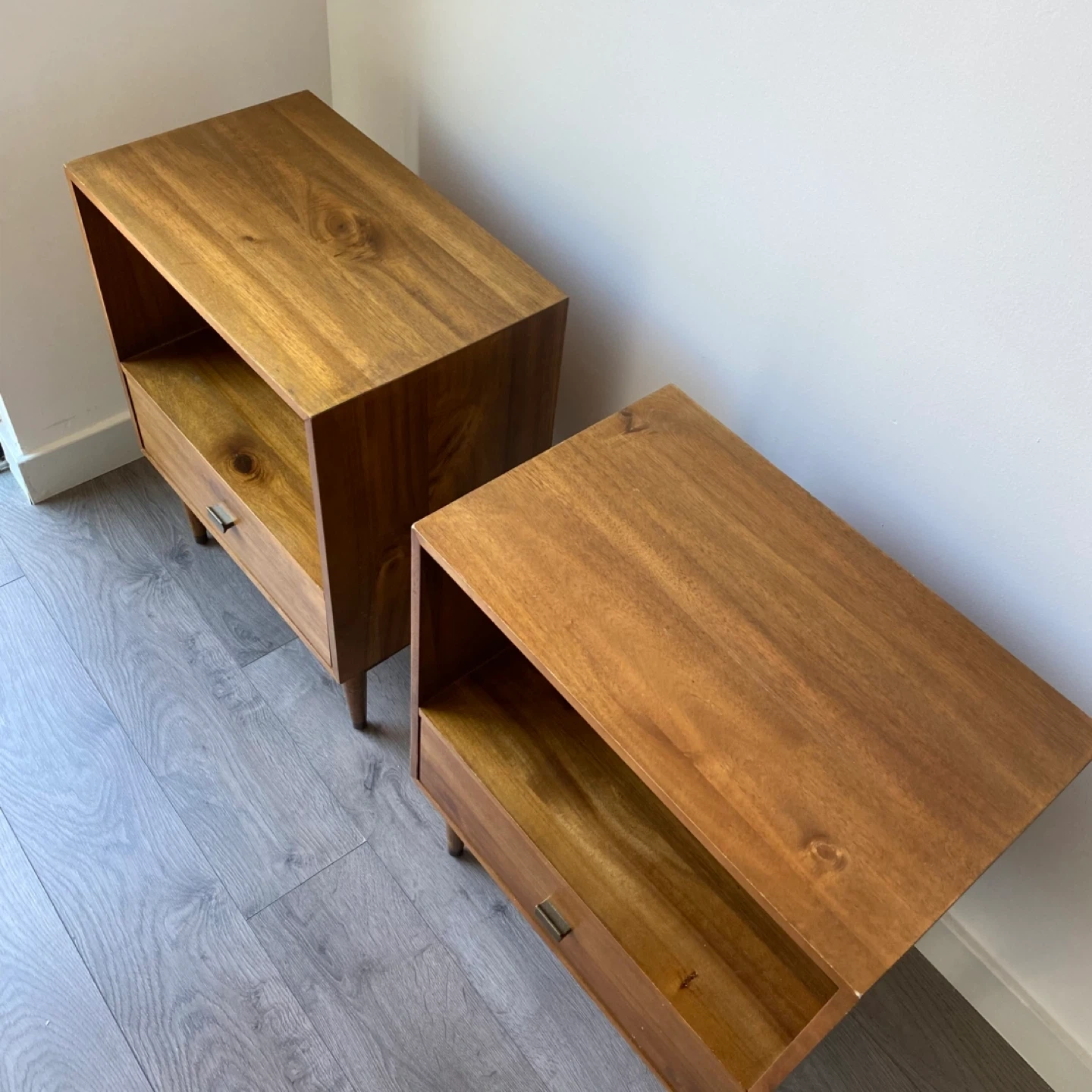 615Pick up only in Leslieville (Queen and Pape) Check out other listings! Teak night stands. $450 for both. Well made and sturdy. There are some minor scratches but in overall great condition. Width 22" Height 28" Depth 14"