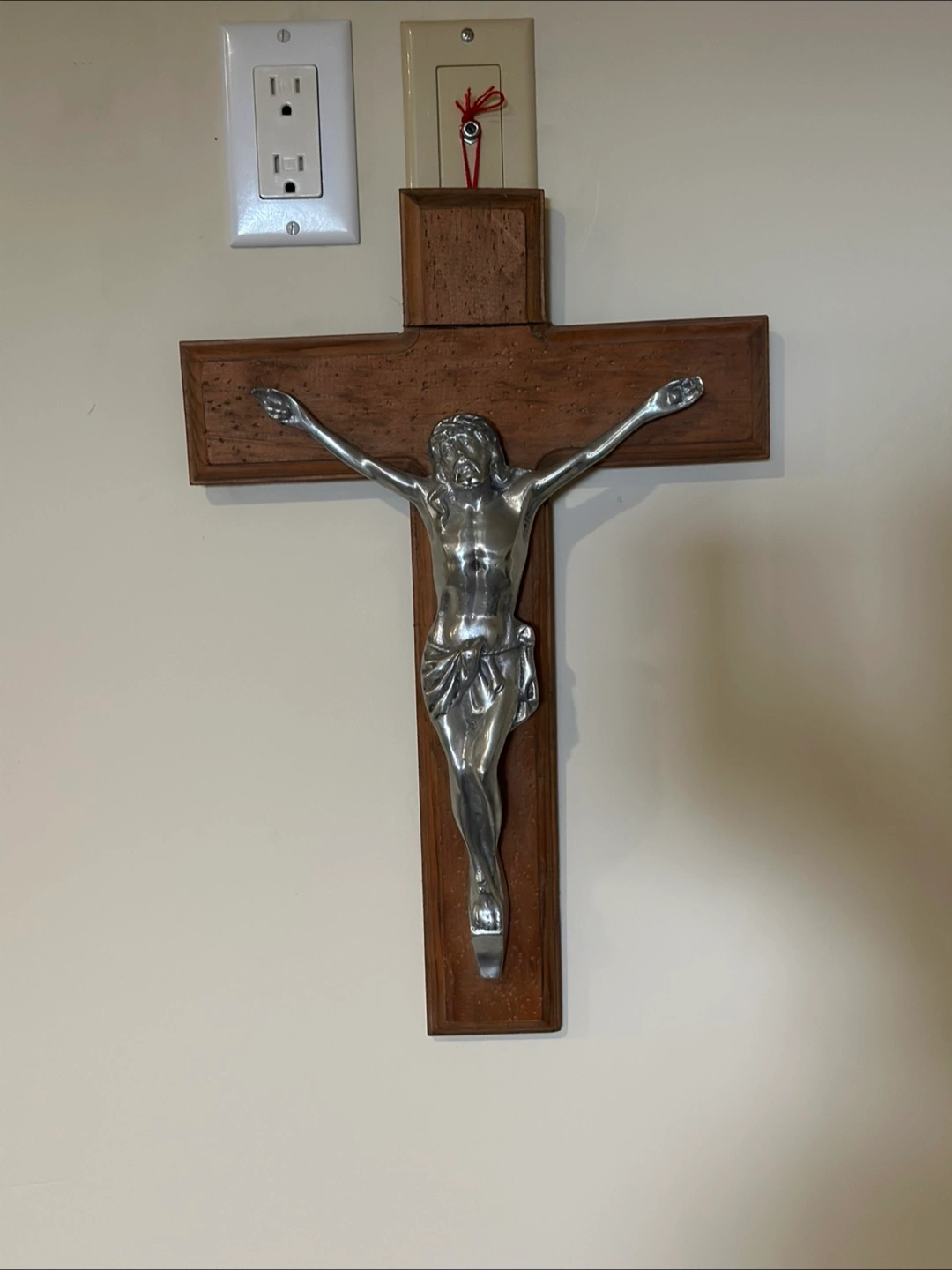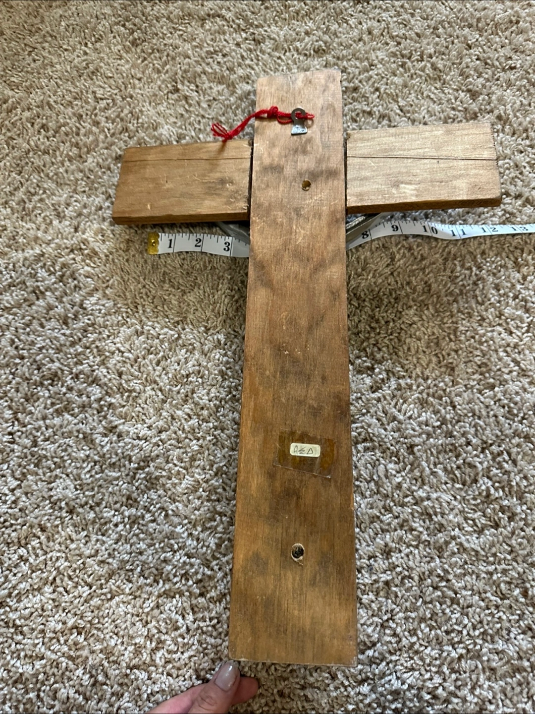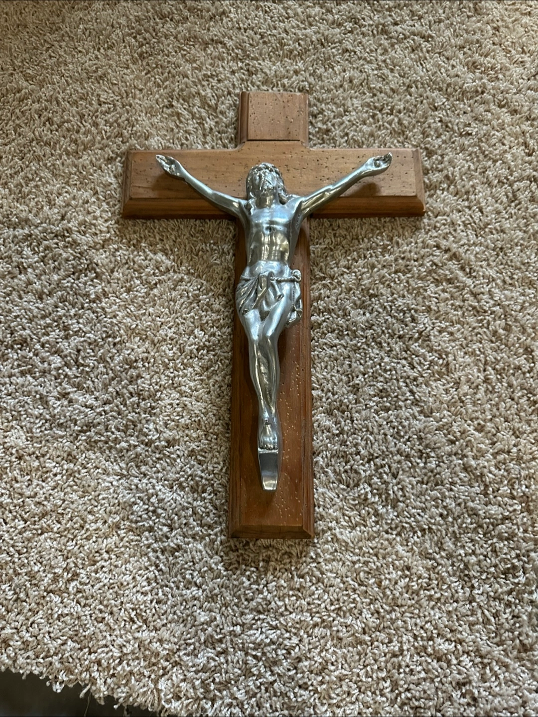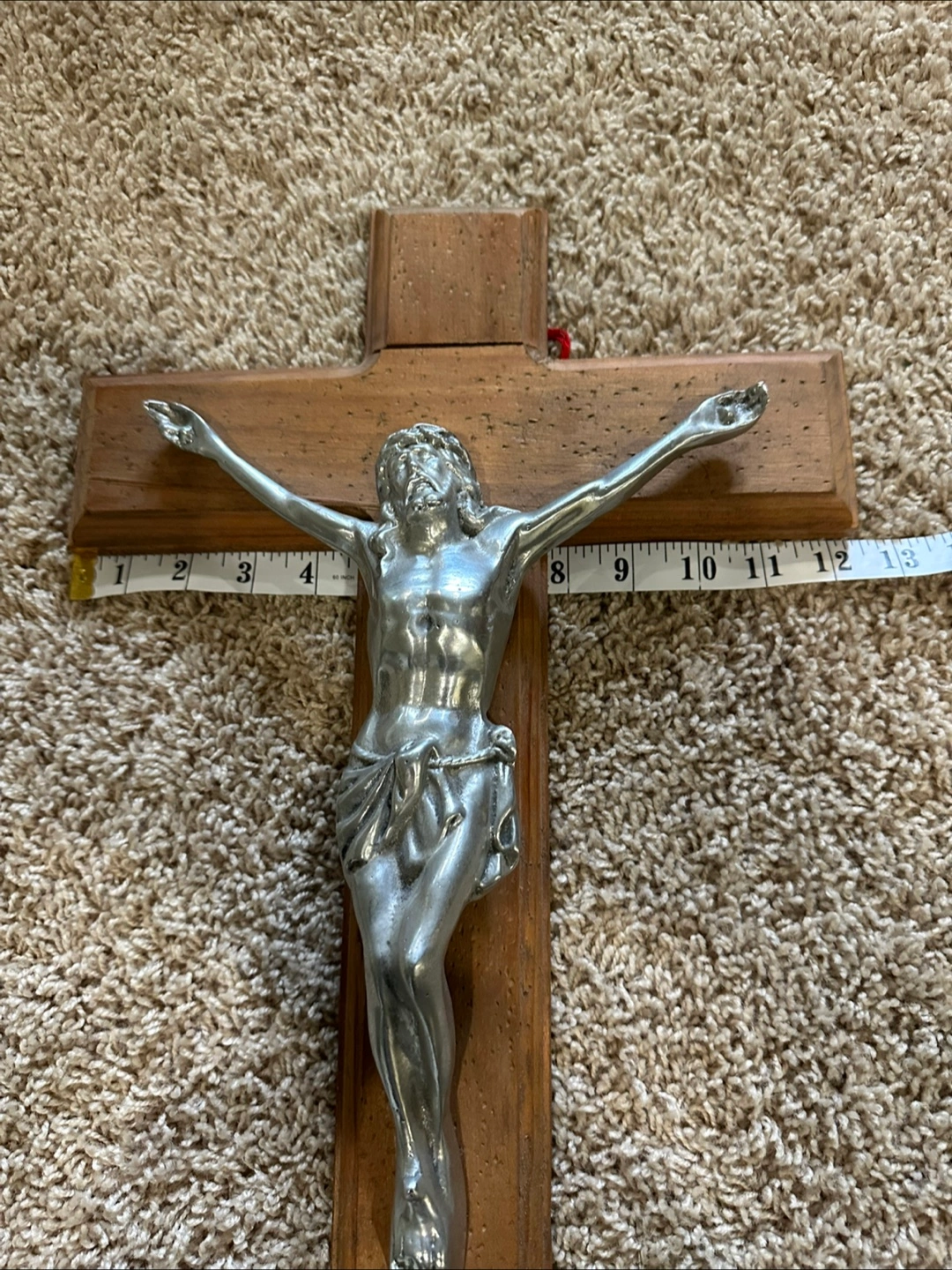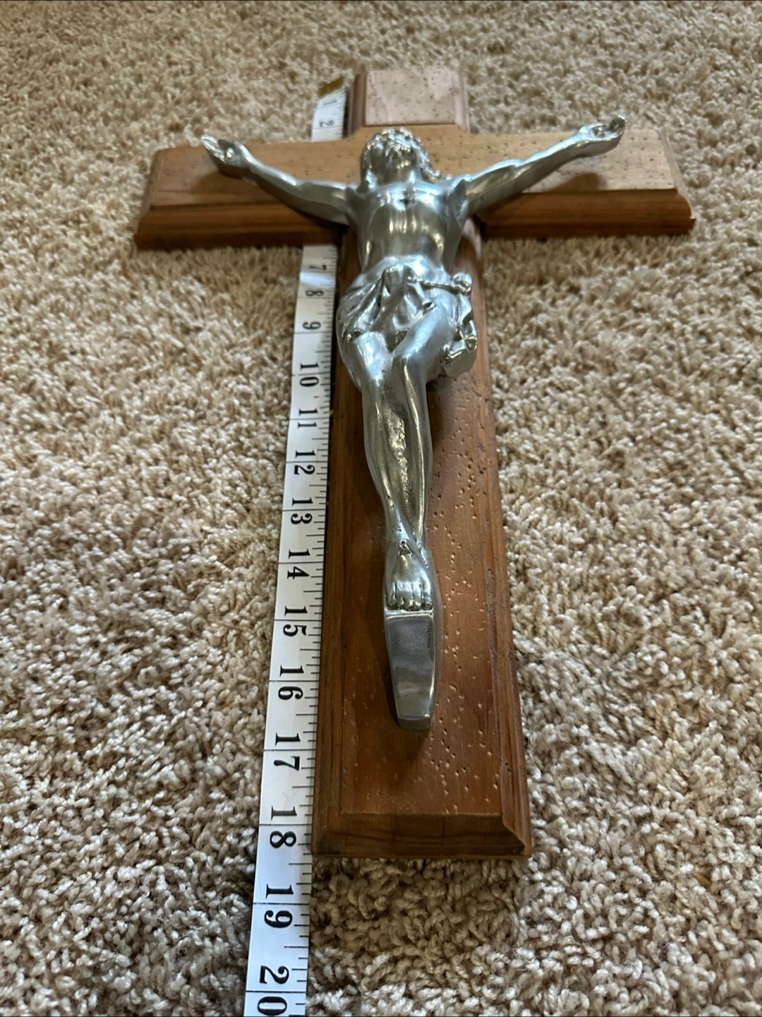 Selling a vintage crucifix made of wood and metal. It measures approximately 19 inches tall and 12 inches wide. It's a beautiful piece for any home!
