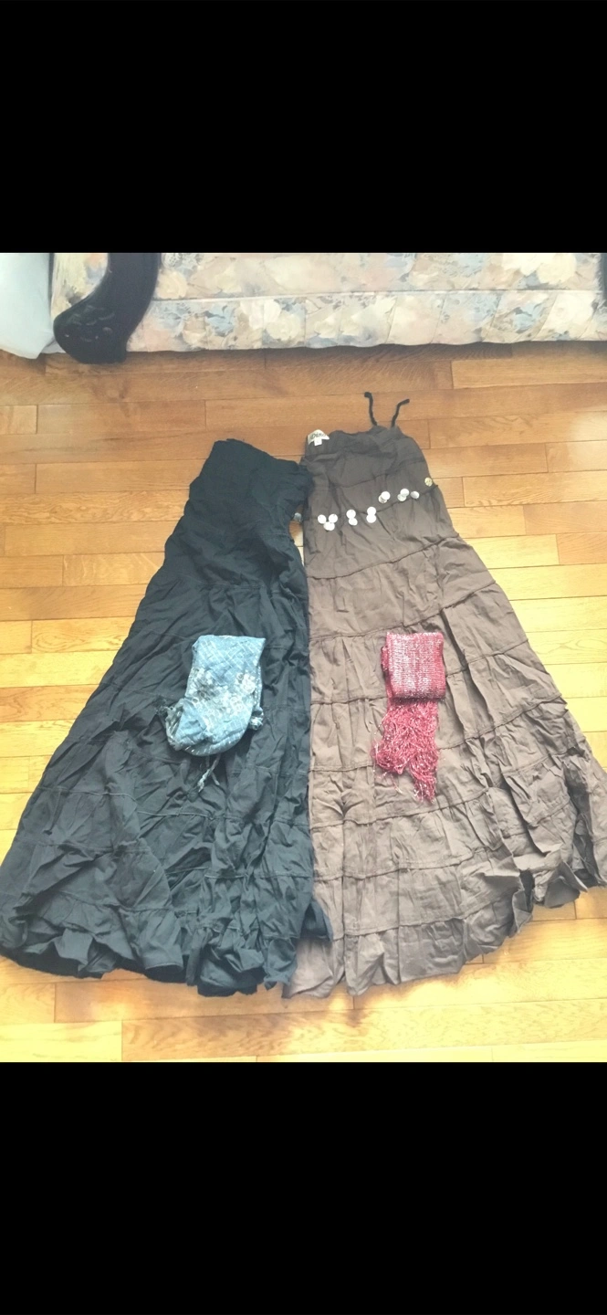 Selling two maxi dresses together! One is a tiered brown dress with button details, and the other is a simple black dress. Both are in good condition and ready for a new home