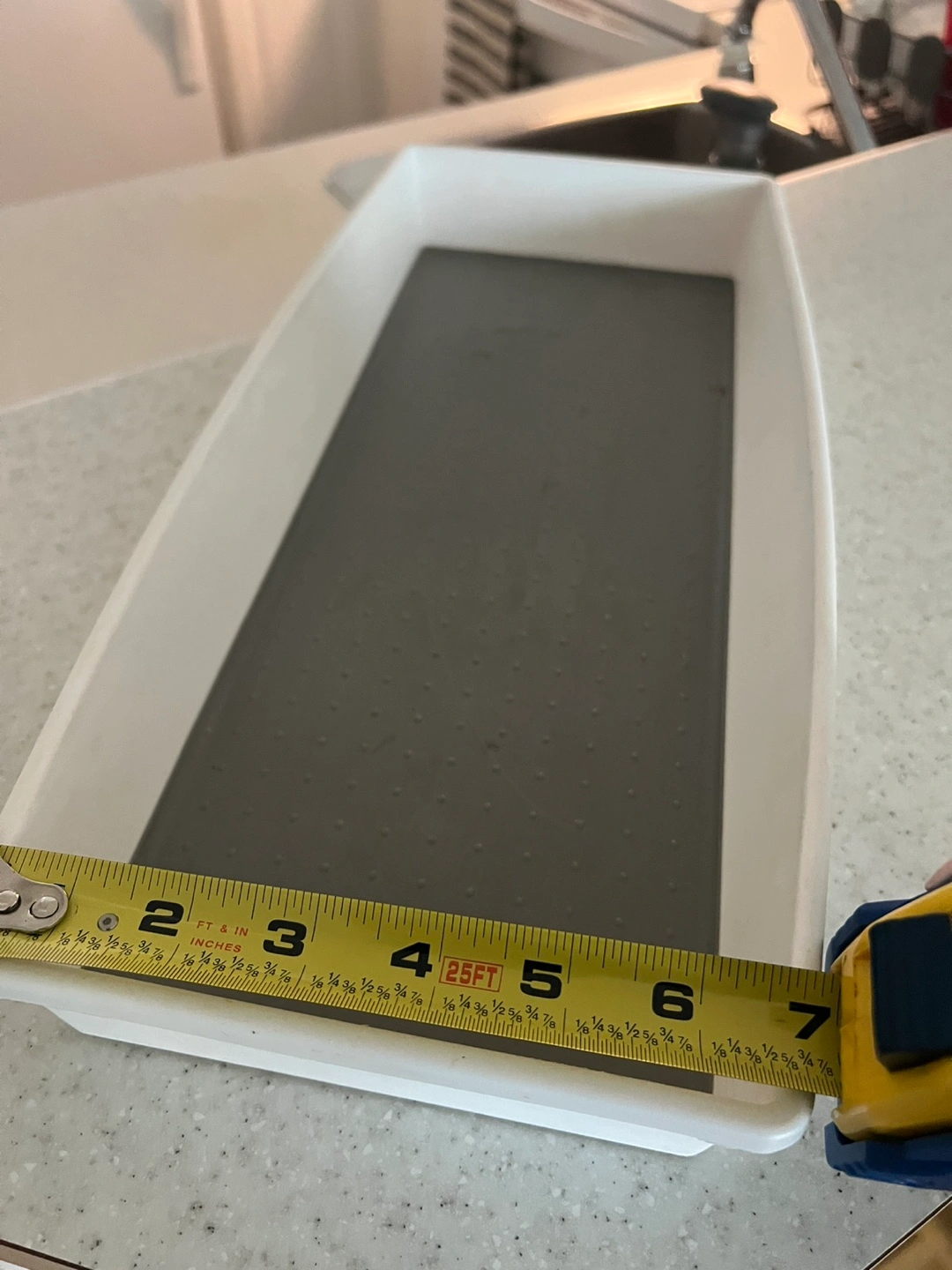 Selling a white plastic tray! It's approximately 15 inches long and 7 inches wide. Perfect for organizing items in your kitchen or bathroom