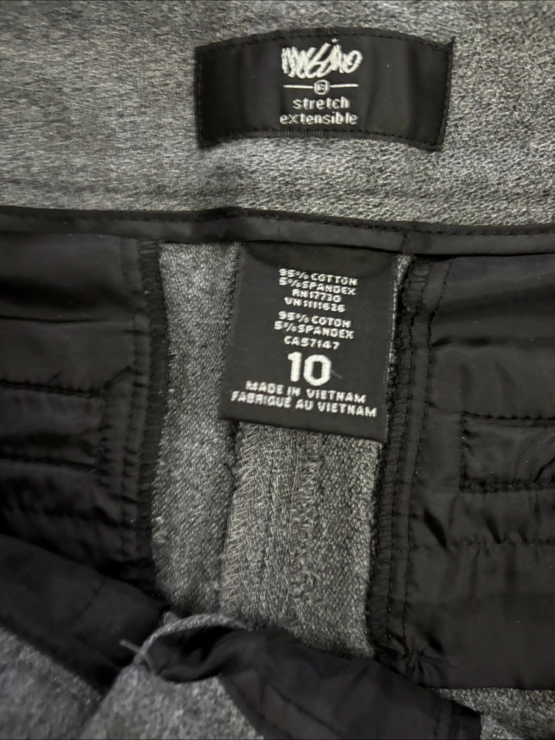 I'm selling a pair of Mossimo brand pants in a lovely gray colour! They are size 10 and have a stretch extensible feature for extra comfort. The material is 95% cotton and 5% spandex, making them super comfy for all-day wear.