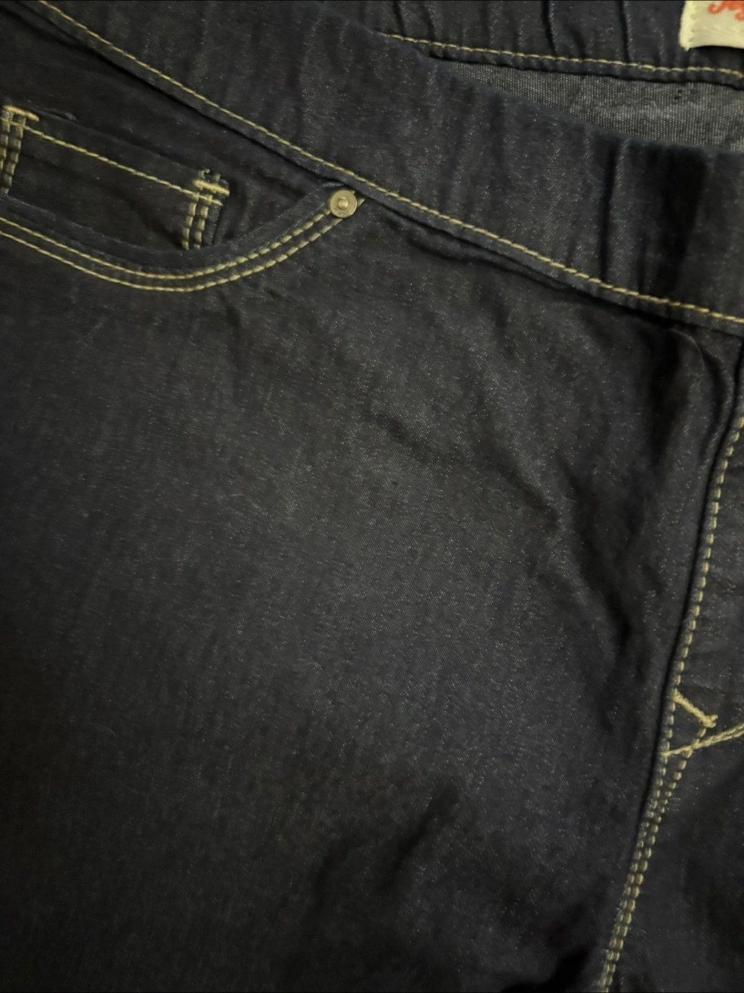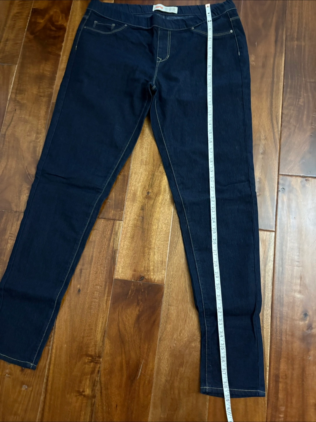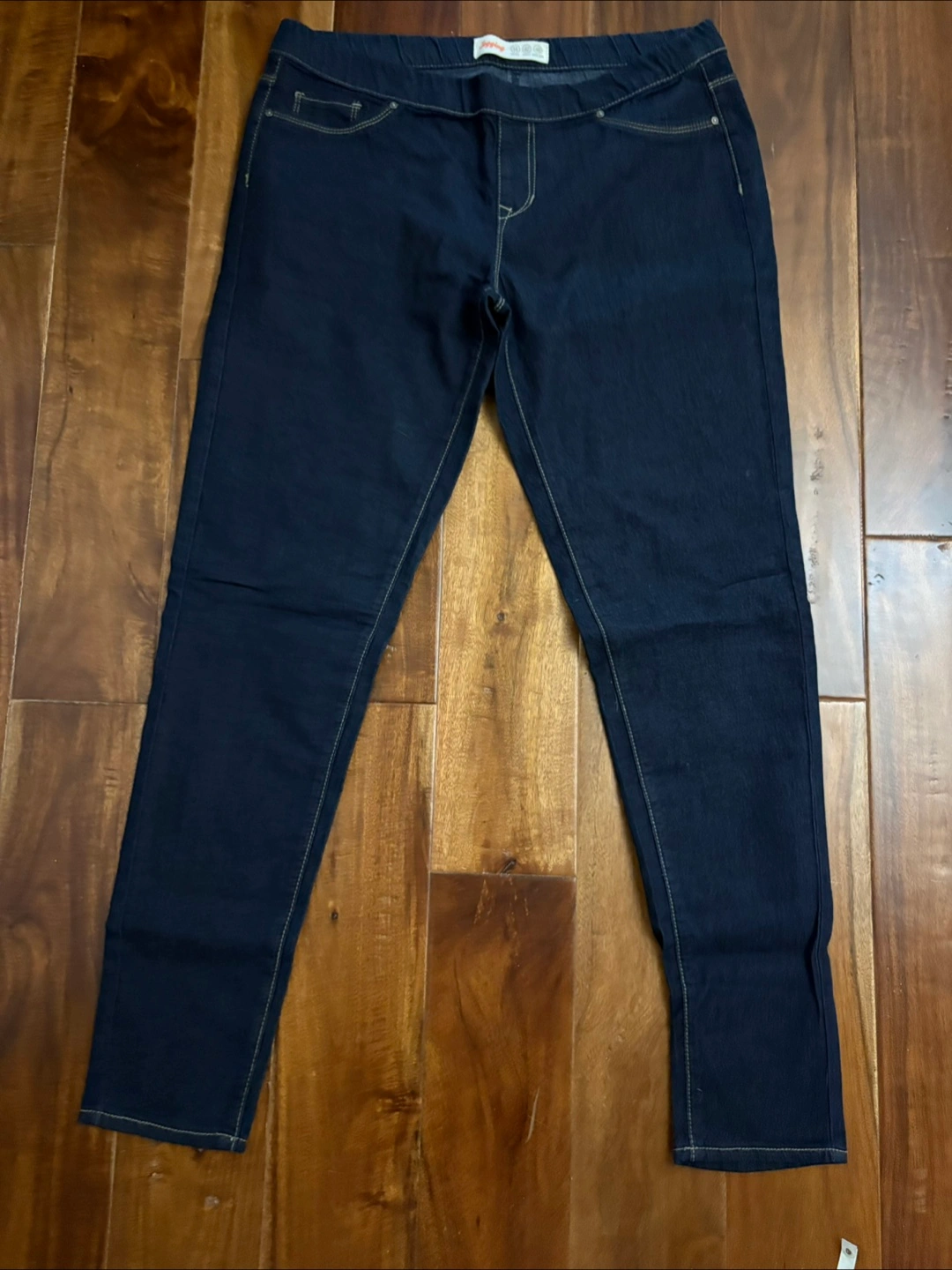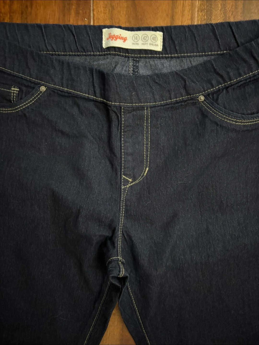 Selling a pair of dark wash jeggings in size 14. They are in great condition and ready for a new home! The material is comfortable and stretchy, making them perfect for everyday wear.
