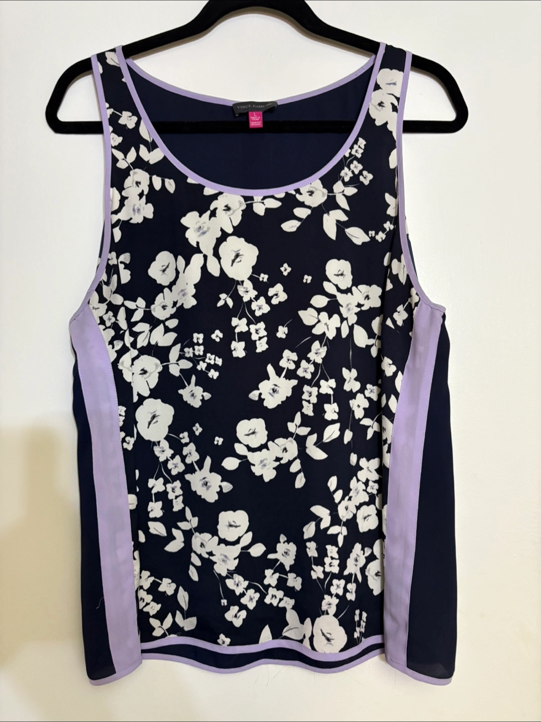 This Vince Camuto tank top is perfect for a warm day! It features a beautiful floral pattern. The top is a size large and is made of 97% polyester and 3% spandex. It's in great condition and ready for a new home!