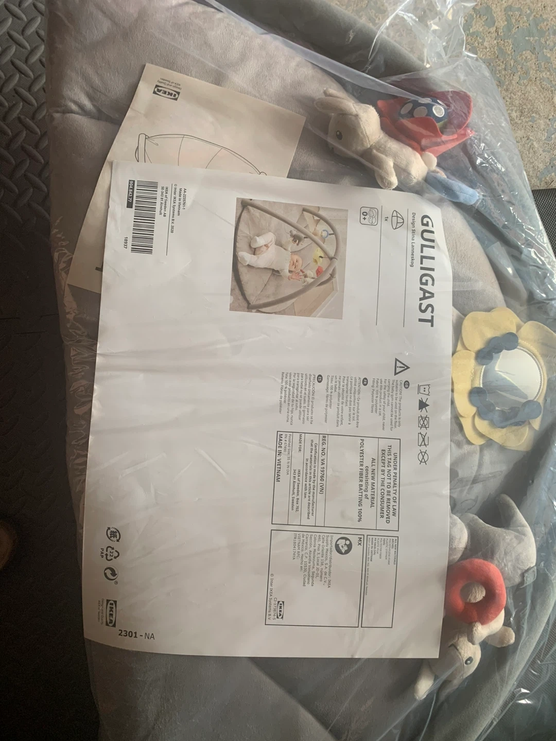 Selling a gently used IKEA Gulligast baby activity gym! It's in great condition and comes with all the original hanging toys. Perfect for babies aged 0 months and up. The gym is easy to assemble and provides a soft, safe space for your little one to play and develop their motor skills. Package dimensions are: Height 5 cm (2 "), Length 102 cm (40 ¼ "), and Width 46 cm (18 ¼ ")